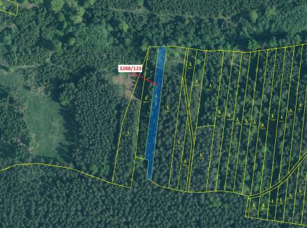 Lesní pozemek o výměře 1707 m2, parcelní číslo 3288/123, podíl 1/1, katastrální území Hosty, obec Hosty, obec s rozšířenou působností Týn nad Vltavou, okres České Budějovice, Jihočeský kraj. Částečně po těžbě.