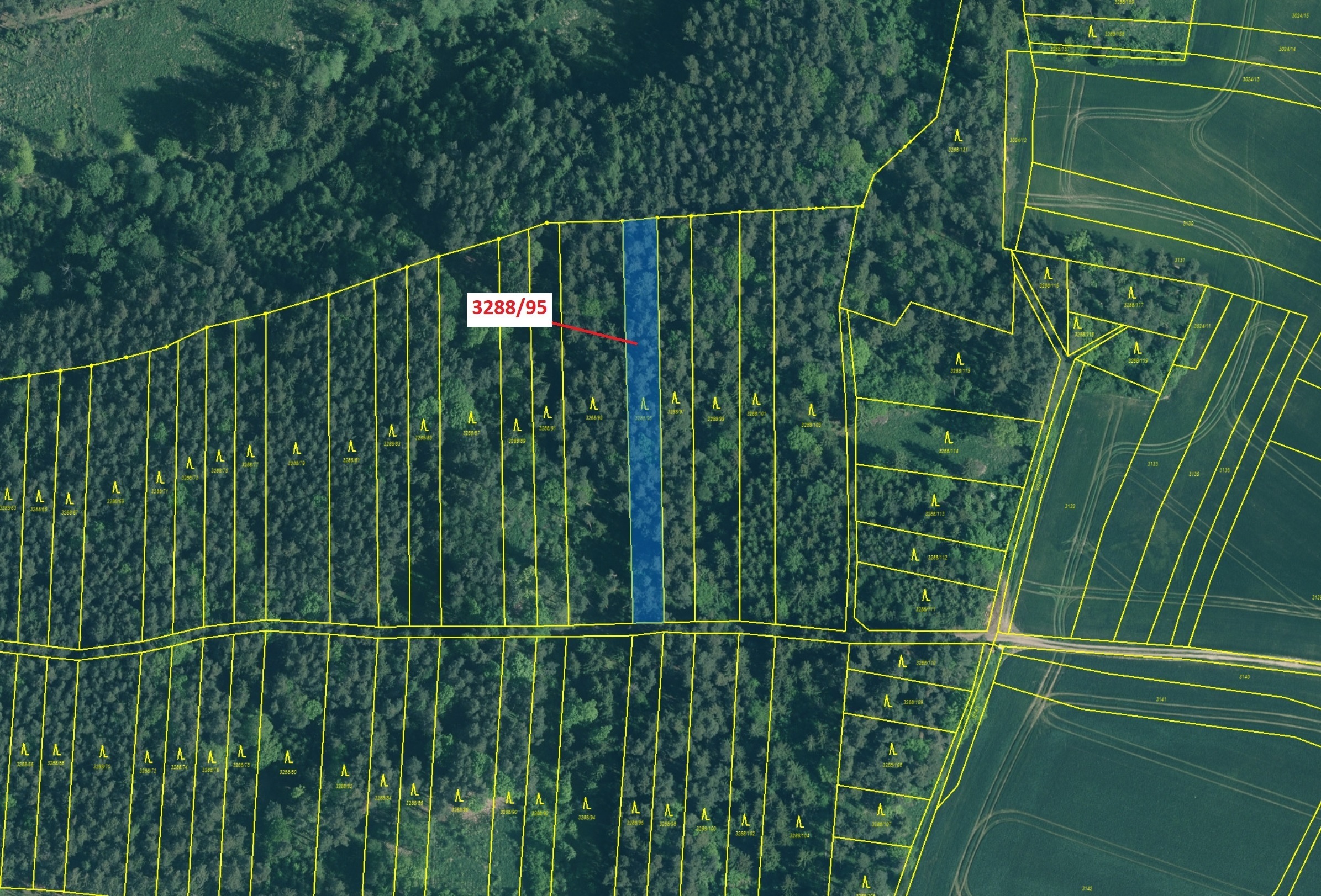 Lesní pozemek o výměře 1735 m2, parcelní číslo 3288/95, podíl 1/1, katastrální území Hosty, obec Hosty, obec s rozšířenou působností Týn nad Vltavou, okres České Budějovice, Jihočeský kraj. Po těžbě.