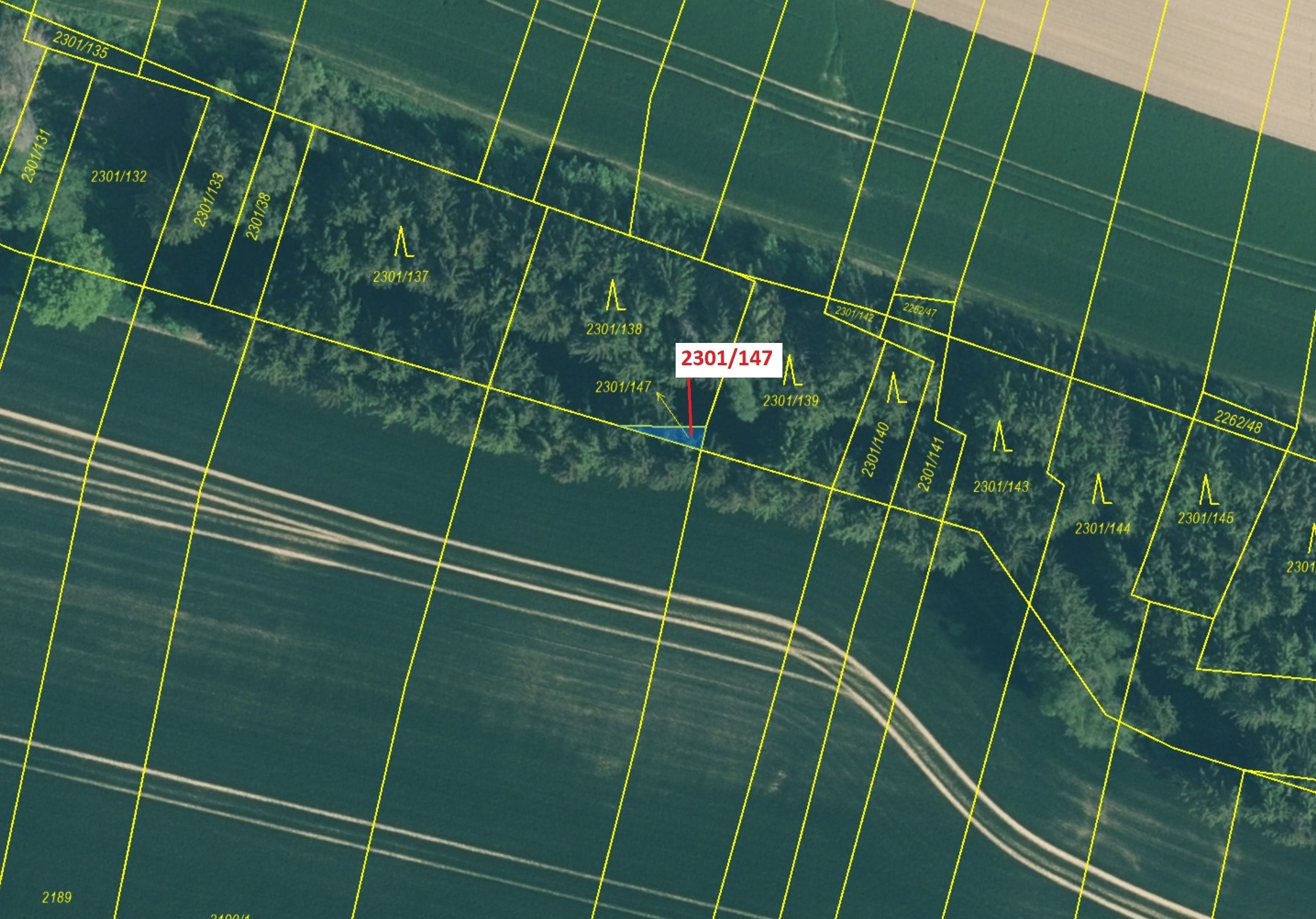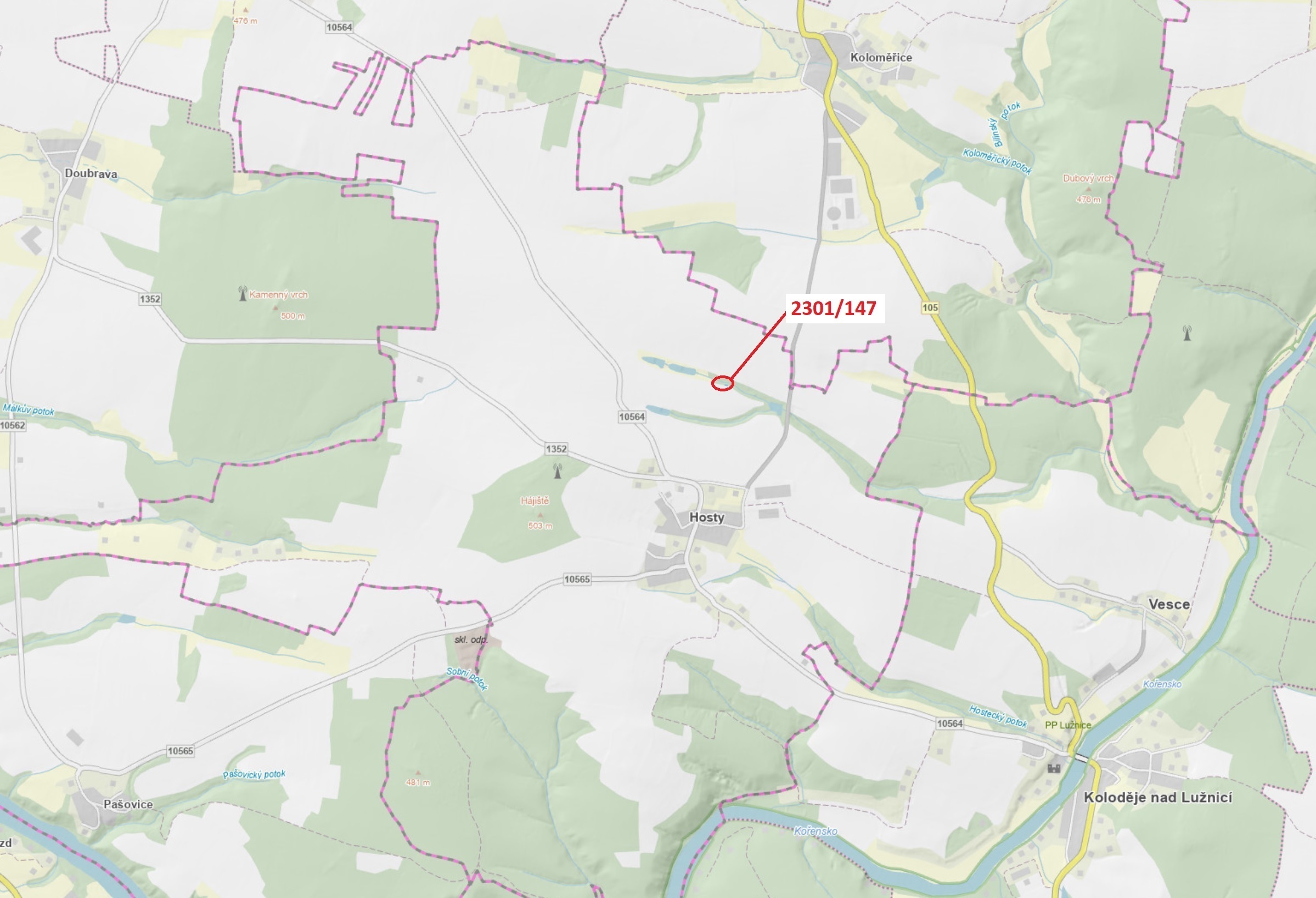 Lesní pozemek o výměře 19 m2, parcelní číslo 2301/147, podíl 1/1, katastrální území Hosty, obec Hosty, obec s rozšířenou působností Týn nad Vltavou, okres České Budějovice, Jihočeský kraj.
