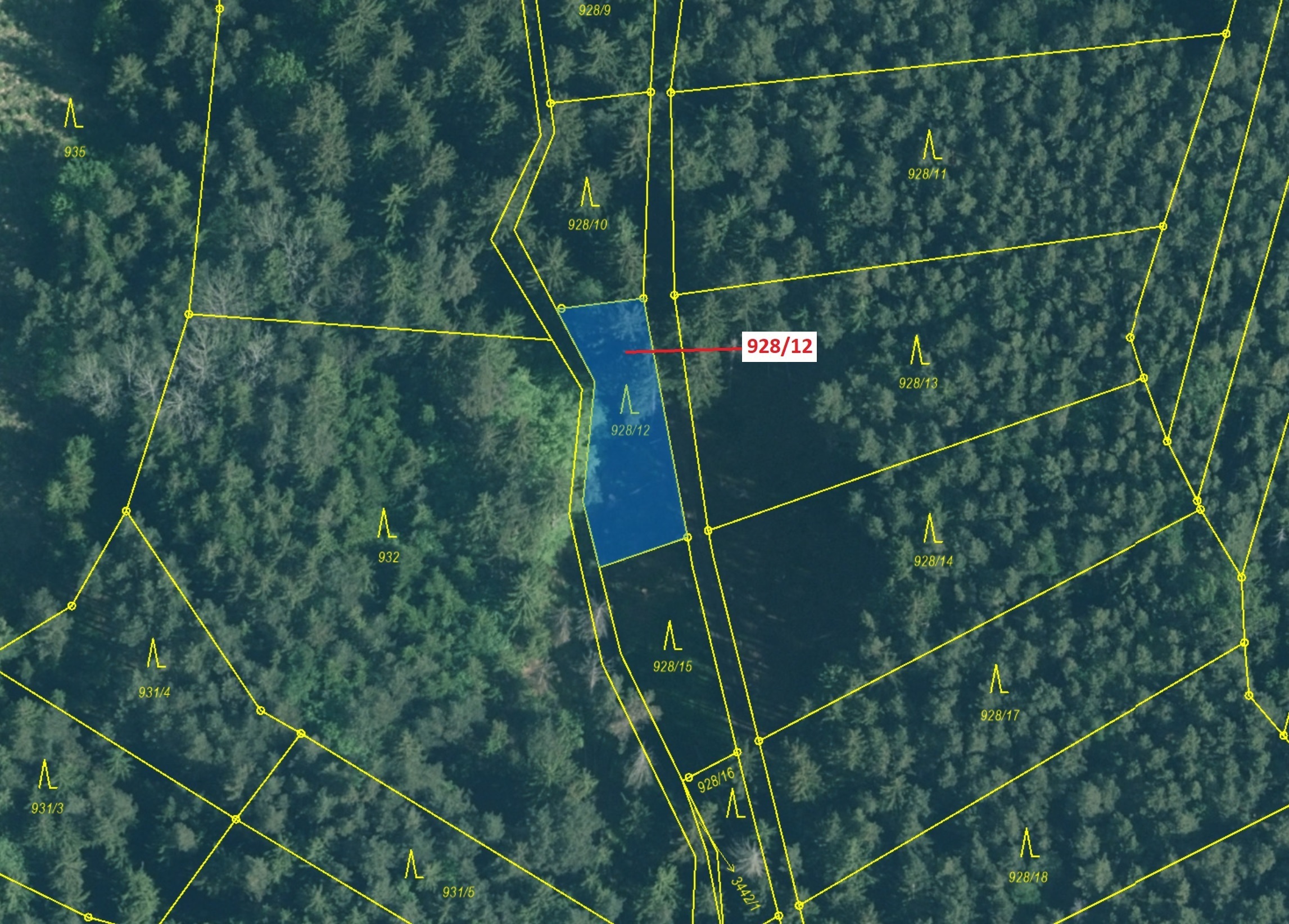Lesní pozemek o výměře 418 m2, parcelní číslo 928/12, podíl 1/1, katastrální území Hosty, obec Hosty, obec s rozšířenou působností Týn nad Vltavou, okres České Budějovice, Jihočeský kraj. Po těžbě.