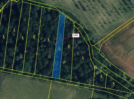 Lesní pozemek o výměře 1221 m2, parcelní číslo 1360, podíl 1/1, katastrální území Hradčany na Moravě, obec Hradčany, obec s rozšířenou působností Přerov, okres Přerov, Olomoucký kraj. Po těžbě.
