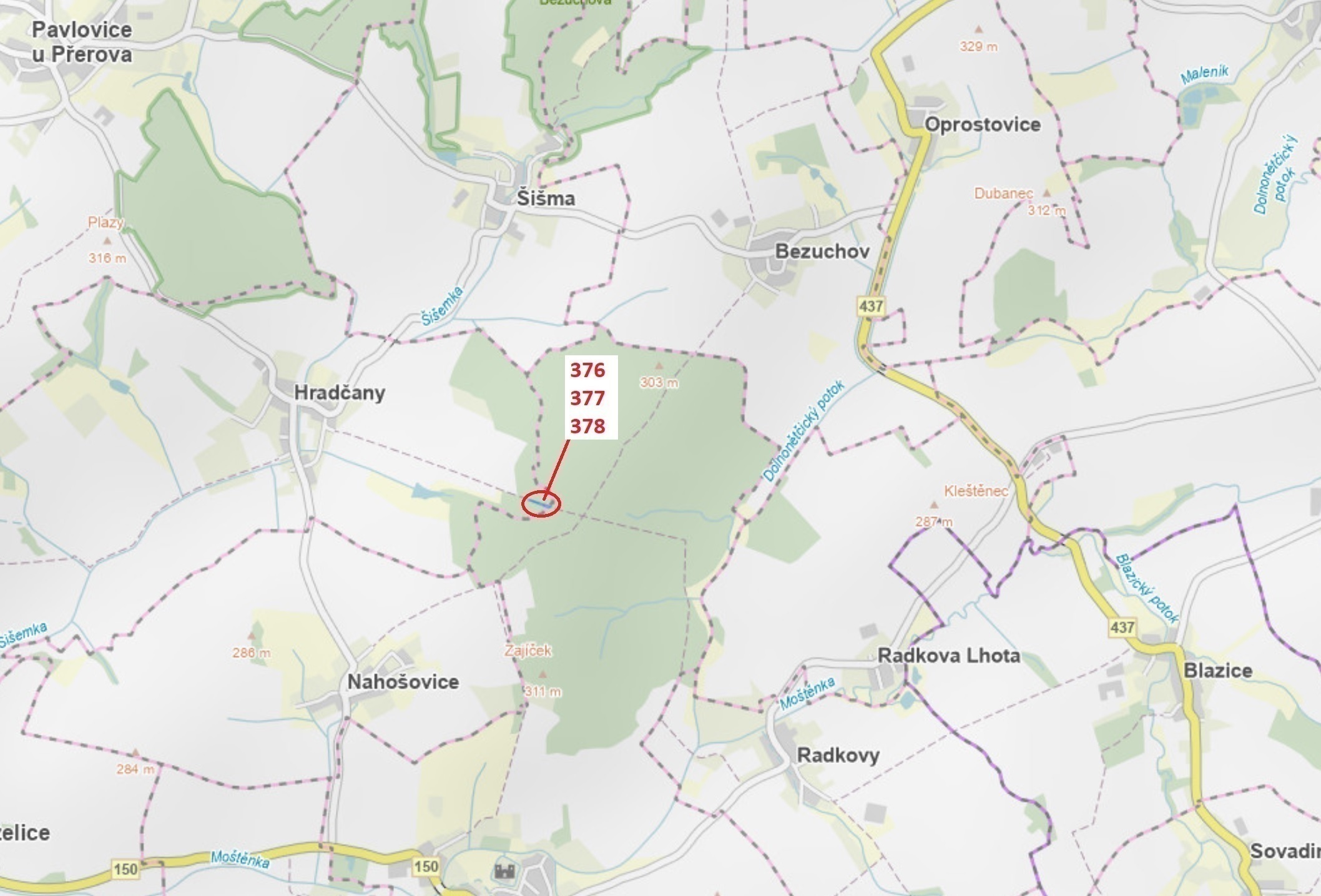 Lesní pozemky o výměře 1703 m2, parcelní čísla 376, 377, 378, podíl 1/1, katastrální území Hradčany na Moravě, obec Hradčany, obec s rozšířenou působností Přerov, okres Přerov, Olomoucký kraj. Po těžbě.