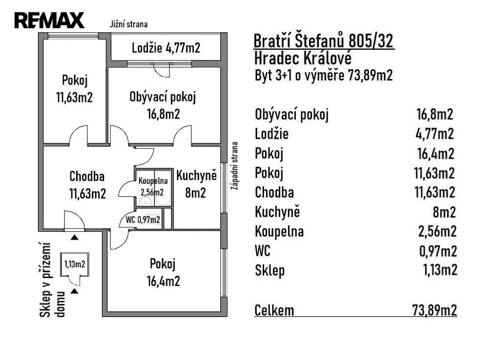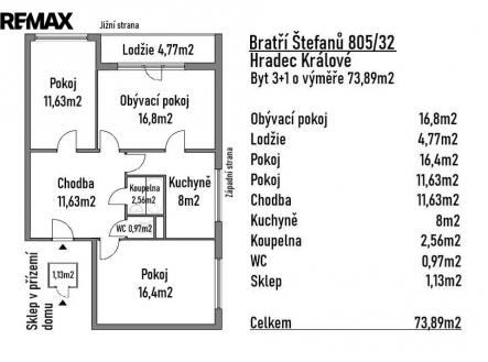 Výhradně Vám nabízíme ke koupi byt o dispozici 3+1 s celkovou plochou 73,89 m², z toho 4,77m2 tvoří lodžie 1,13 m² sklep. Byt je v osobním vlastnictví a nachází se ve 4. patře panelového domu v ulici Bratří Štefanů, č. p. 805/32. Dispozice bytu nabízí praktické a dobře řešené uspořádání. Dominantou je prostorný obývací pokoj o velikosti 16,8 m² se vstupem na velkou lodžii (4,77 m²), která poskytuje příjemný výhled do okolí. Dále je k dispozici kuchyň (8 m²), dva samostatné pokoje (16,4 m² a 11,63 m²), koupelna (2,56 m²), samostatné WC (0,97 m²) a prostorná chodba (11,63 m²). K bytu náleží sklepní kóje a možnost využívat společné prostory domu, jako je kolárna či sušárna. Byt je orientován na jižní a západní stranu, díky čemuž je příjemně prosvětlený po celý den. Nemovitost je v původním, avšak udržovaném stavu, což představuje případně i ideální příležitost pro rekonstrukci dle vlastních představ a vytvoření moderního bydlení přesně podle Vašich požadavků. Součástí prodeje je stávající kuchyňská linka a sanitární vybavení koupelny. Bytový dům nabízí bezbarierový přístup. Bytový dům je průběžně udržován a spravován SVJ. Byt je napojen na veškeré inženýrské sítě (elektřina, plyn, voda, kanalizace). Výhodou jsou velmi nízké měsíční náklady, kdy fond oprav činí 1 330 Kč. SVJ nemá žádný úvěr. Lokalita nabízí kompletní občanskou vybavenost v docházkové vzdálenosti, včetně obchodů, služeb i centra města. Přímo před domem se nachází dětské hřiště. Jedná se o klidnou a vyhledávanou lokalitu vhodnou jak pro rodinné bydlení, tak i jako investice. Kupní cena je konečná a zahrnuje právní servis i úschovu kupní ceny. V případě zájmu o financování hypotečním úvěrem Vám rádi zajistíme služby zkušeného hypotečního specialisty. Byt je ihned k dispozici. Prodávající si vyhrazuje právo vybrat kupujícího dle vlastních kritérií. V případě zájmu o více informací či domluvení prohlídky mě neváhejte kontaktovat. Prodávající si vyhrazuje právo vybrat kupujícího na základě jím zvolených kritérií.