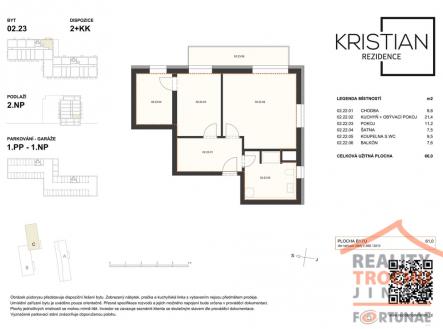 V novém developerském projektu Rezidence Kristian nabízíme prodej, moderního a nízkoenergetického bydlení v bytu 2+kk s balkónem ve vyhledávané lokalitě v Hradci Králové – Moravské Předměstí. Bytová jednotka se nachází ve 2. NP zděného bytového domu, celková užitná plocha 66 m2, balkón - 7,6 m2, šatna 7,5 m2. K bytu náleží 1x vnitřní parkovací stání. Dispozice: vstupní chodba, obývací pokoj s kuchyňským koutem, ložnice, šatna, koupelna s WC. Vytápění: ústřední dálkové. Ve standardním provedení: plastová okna hranatá s izolačním trojsklem, vinylové podlahy KPP – výběr z 12 typů dekorů, koupelna s keramickou dlažbou La Ceramica Factory – výběr ze 4 dekorů, obklady Rako Systém, umyvadlo keramické se stojánkovou pákovou baterií, vana bílá akrylátová obdélníková. WC závěsné bílé. Použité materiály kombinují moderní technologie a udržitelnost a především snižují energetické náklady. Bytová jednotka se nachází na Moravském Předměstí v novostavbě bytového domu v Rezidenci Kristian. Výhodou lokality je veškerá občanská vybavenost v místě a výborná dopravní dostupnost. Pěkné, klidné bydlení pro rodinu s dětmi. Parkování je zajištěno v podzemních garážích a venkovních parkovištích přímo v rezidenci. Bližší informace Vám rádi sdělíme v realitní kanceláři. Máme pro Vás připraveny informace k hypotečnímu úvěru, který vyřídíme podle Vašich požadavků.