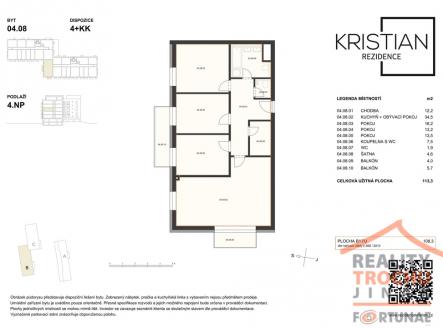 V novém developerském projektu rezidence Kristian Vám nabízíme prodej, moderního a nízkoenergetického bydlení v bytu 4+kk s balkónem ve vyhledávané lokalitě v Hradci Králové – Moravské Předměstí. Bytová jednotka se nachází ve 4. NP zděného bytového domu, celková užitná plocha 113,3 m2, 2 x balkón (5,7 m2 a 4 m2), 1x šatna (4,6 m2). K bytu náleží 1x vnitřní parkovací stání. Dispozice: vstupní chodba, obývací pokoj s kuchyňským koutem, jídelnou, 3x pokoj, koupelna s WC, WC, šatna. Vytápění: ústřední dálkové. Ve standardním provedení: plastová okna hranatá s izolačním trojsklem, vinylové podlahy KPP – výběr z 12 typů dekorů, koupelna s keramickou dlažbou La Ceramica Factory – výběr ze 4 dekorů, obklady Rako Systém, umyvadlo keramické se stojánkovou pákovou baterií, vana bílá akrylátová obdélníková. WC závěsné bílé. Použité materiály kombinují moderní technologie a udržitelnost a především snižují energetické náklady. Bytová jednotka se nachází na Moravském Předměstí v novostavbě bytového domu v Rezidenci Kristian. Výhodou lokality je veškerá občanská vybavenost v místě a výborná dopravní dostupnost. Pěkné, klidné bydlení pro rodinu s dětmi. Parkování je zajištěno v podzemních garážích a venkovních parkovištích přímo v rezidenci. Bližší informace Vám rádi sdělíme v realitní kanceláři. Máme pro Vás připraveny informace k hypotečnímu úvěru, který vyřídíme podle Vašich požadavků.
