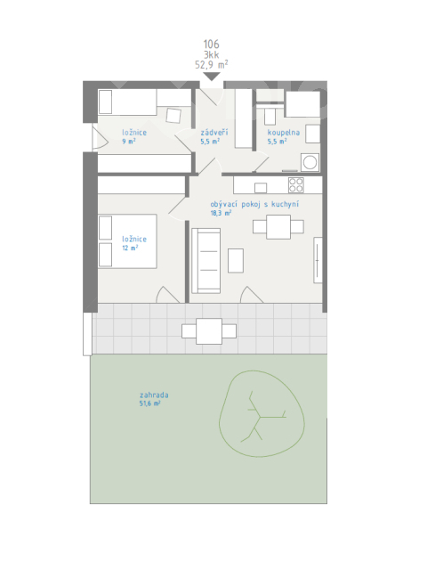 Nový byt 3+kk v moderní rezidenci v Hradci Králové Nabízíme k prodeji zcela nový byt 3+kk v nově realizovaném developerského projektu Rezidence Pra žská 84, který vzniká v atraktivní části Hradce Králové. Velikost bytu je 52,9 m2, k bytu navíc náleží zahrada o velikosti 51,6m2. Byt je orientovaný na jihozápad a nachází se ve 1.nadzemním podlaží. Projekt je výsledkem práce renomovaného ateliéru Žárovka Architekti a celkem nabízí 52 bytových jednotek. Od běžného projektu se odlišuje především nízkopodlažní zástavbou, menším počtem bytů v jednotlivých domech a uzavřeným, klidným konceptem bydlení. Soukromí, bezpečí a technologie budoucnosti Celá rezidence je navržena s důrazem na komfort, bezpečí a dlouhodobou udržitelnost. Obyvatelé mají k dispozici: vlastní fotovoltaickou elektrárnu s bateriovým úložištěm, sprinklerový systém jako aktivní protipožární ochranu, přípravu pro dobíjení elektromobilů u parkovacích stání. Díky těmto prvkům projekt nabízí nejen moderní bydlení, ale i nižší provozní náklady a vyšší míru bezpečí. Lokalita, která funguje Poloha projektu umožňuje rychlé a pohodlné spojení jak do centra města, tak mimo Hradec Králové. MHD je dostupná 1 minutu chůze, nájezd na dálnici D11 je vzdálený přibližně 2 minuty jízdy, do Prahy (Černý Most) se dostanete zhruba za hodinu autem. V bezprostředním okolí najdete lékaře, školy, školky i nákupní centrum Aupark, což dělá z lokality ideální místo pro každodenní život. Možnost klientských úprav Do určité fáze výstavby je možné: upravit standardy interiéru, u vybraných bytů měnit dispozici či podlahovou plochu, přizpůsobit bydlení vlastním představám ještě před dokončením. Parkování a společné prostory Veškerá parkovací stání jsou řešena v krytých prostorech pod budovou, takže okolí domů zůstává klidné, čisté a bez rušivých prvků. Na projekt navazuje komunitní zahrada, která vytváří přirozený prostor pro setkávání rezidentů i relax. Kvalitní standard bydlení Byty jsou navrženy s důrazem na funkční dispozice a nadčasový design. Standard zahrnuje kvalitní podlahy, dveře a obklady v souladu s aktuálními trendy, přičemž je možné zvolit i prémiové materiály. Financování bez starostí V případě potřeby vám zajistíme kompletní hypoteční servis a výhodné podmínky financování napříč bankovním trhem - od prvního návrhu až po podpis úvěrové smlouvy. Ideální volba pro vlastní bydlení i investici.