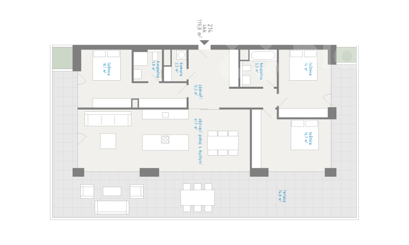 Nový byt 4+kk s prostornou terasou v moderní rezidenci v Hradci Králové Nabízíme k prodeji zcela nový byt 4+kk v nově realizovaném developerského p rojektu Rezidence Pražská 84, který vzniká v atraktivní části Hradce Králové. Velikost bytu je 119,8 m2, k bytu navíc náleží prostorná terasa o velikosti 74,8m2, která obklopuje byt ze všech stran. Tento nadstandardní byt tak bude díky velkým oknům krásně prosvětlený, výhodou je také orientace na všechny světové strany, s terasou převážně na jih. Projekt je výsledkem práce renomovaného ateliéru Žárovka Architekti a celkem nabízí 52 bytových jednotek. Od běžného projektu se odlišuje především nízkopodlažní zástavbou, menším počtem bytů v jednotlivých domech a uzavřeným, klidným konceptem bydlení. Soukromí, bezpečí a technologie budoucnosti Celá rezidence je navržena s důrazem na komfort, bezpečí a dlouhodobou udržitelnost. Obyvatelé mají k dispozici: - vlastní fotovoltaickou elektrárnu s bateriovým úložištěm, - sprinklerový systém jako aktivní protipožární ochranu, - přípravu pro dobíjení elektromobilů u parkovacích stání. Díky těmto prvkům projekt nabízí nejen moderní bydlení, ale i nižší provozní náklady a vyšší míru bezpečí. Lokalita, která funguje Poloha projektu umožňuje rychlé a pohodlné spojení jak do centra města, tak mimo Hradec Králové. MHD je dostupná 1 minutu chůze, nájezd na dálnici D11 je vzdálený přibližně 2 minuty jízdy, do Prahy (Černý Most) se dostanete zhruba za hodinu autem. V bezprostředním okolí najdete lékaře, školy, školky i nákupní centrum Aupark, což dělá z lokality ideální místo pro každodenní život. Možnost klientských úprav Do určité fáze výstavby je možné: upravit standardy interiéru, u vybraných bytů měnit dispozici přizpůsobit bydlení vlastním představám ještě před dokončením. Parkování a společné prostory Veškerá parkovací stání jsou řešena v krytých prostorech pod budovou, takže okolí domů zůstává klidné, čisté a bez rušivých prvků. Na projekt navazuje komunitní zahrada, která vytváří přirozený prostor pro setkávání rezidentů i relax. Kvalitní standard bydlení Byty jsou navrženy s důrazem na funkční dispozice a nadčasový design. Standard zahrnuje kvalitní podlahy, dveře a obklady v souladu s aktuálními trendy, přičemž je možné zvolit i prémiové materiály. Financování bez starostí V případě potřeby vám zajistíme kompletní hypoteční servis a výhodné podmínky financování napříč bankovním trhem - od prvního návrhu až po podpis úvěrové smlouvy.