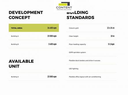 Pronájem skladu, výrobních prostor Hustopeče. V zastoupení majitele a bez provize nabízíme velice kvalitní, variabilní nebytové prostory, umístěné v nově budovaném moderním komerčním parku. K dispozici bude samostatná industriální budova, skladové, velkoobchodní, výrobní či provozní prostory až 20400 m², které lze dělit na samostatné jednotky od cca 2800 m². - existující prostory, k dispozici ihned 11000 m² - nákladní vstupy z hydraulických krytých ramp i vjezdy v úrovni vozovky - podlahy s nosností minimálně 5 t/m² - světlá výška 10 m, led osvětlení - kanceláře, zázemí, showroom na míru, dle požadavku - příjezd a manipulace TIR bezproblémové - ostraha, parkovací plochy, MHD, kantýna v areálu - perfektní lokalita a viditelnost přímo u exitu 25 z D2 Cena k jednání, dle dalších podmínek smlouvy + služby. Fotografie hotových budov jsou ilustrační, z již realizované výstavby. Pro více informací nás kontaktujte.