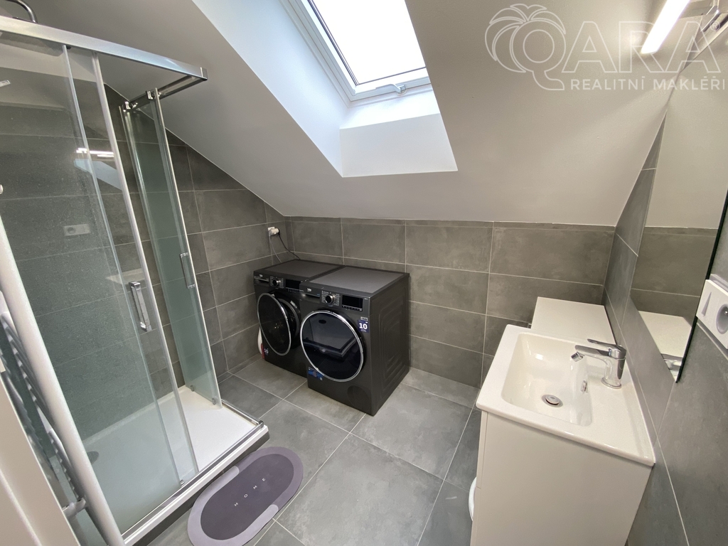 Exkluzivně nabízíme pronájem zařízeného bytu 2+kk v Ivanovicích na Hané. Byt se nachází ve 2. nadzemním podlaží v novostavbě bytového domu na ulici Horní Valy. Podkrovní byt s klimatizací je o velikosti 51,63 m2. Kuchyně je vybavená indukční varnou deskou, elektrickou troubou, myčkou, ledničkou i mikrovlnkou. V jídelní části najdete kulatý stůl se židlemi. V obývací části na vás čeká pohodlná sedací souprava se skříňkou a televizí. Ložnice je zařízena manželskou postelí, šatní skříní se zrcadlem a nočními stolky. Koupelna je vybavena sprchovým koutem a nachází se v ní i pračka se sušičkou. Měsíční nájemné je 19.000,- Kč + 3.500,- Kč platba za energie. Internet a televize od O2 je v ceně nájmu. Majitel požaduje jistotu (kauci) ve výši 22.500,- Kč. Provize RK je 22.500,- Kč. Byt je vhodný pro 2 osoby.