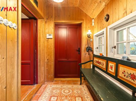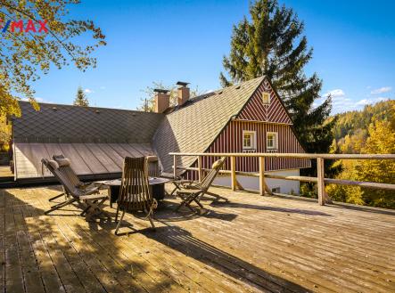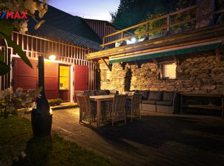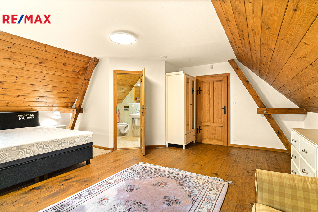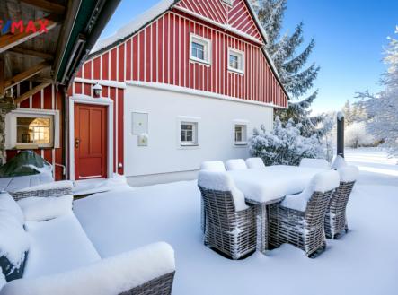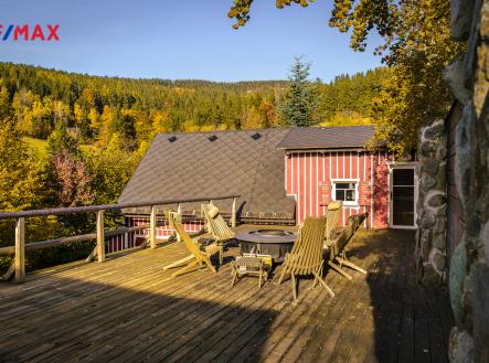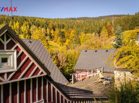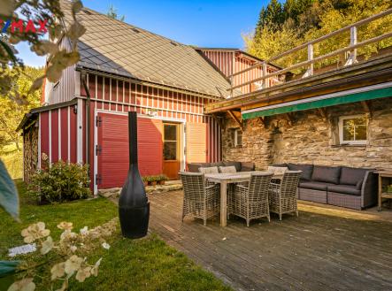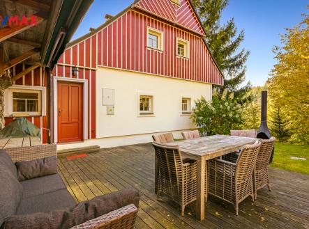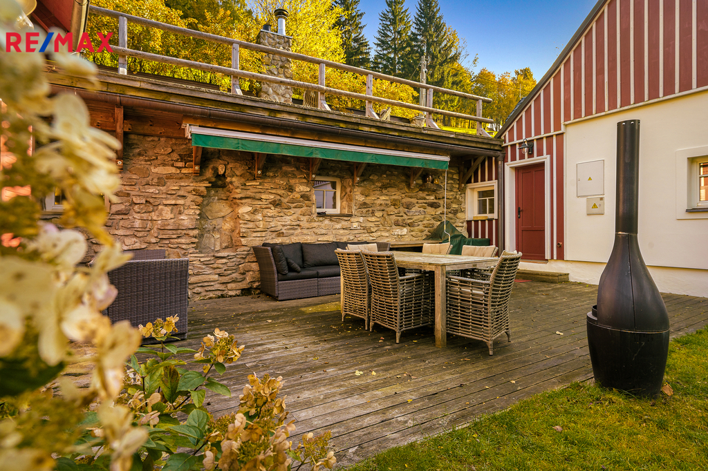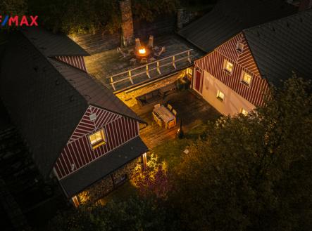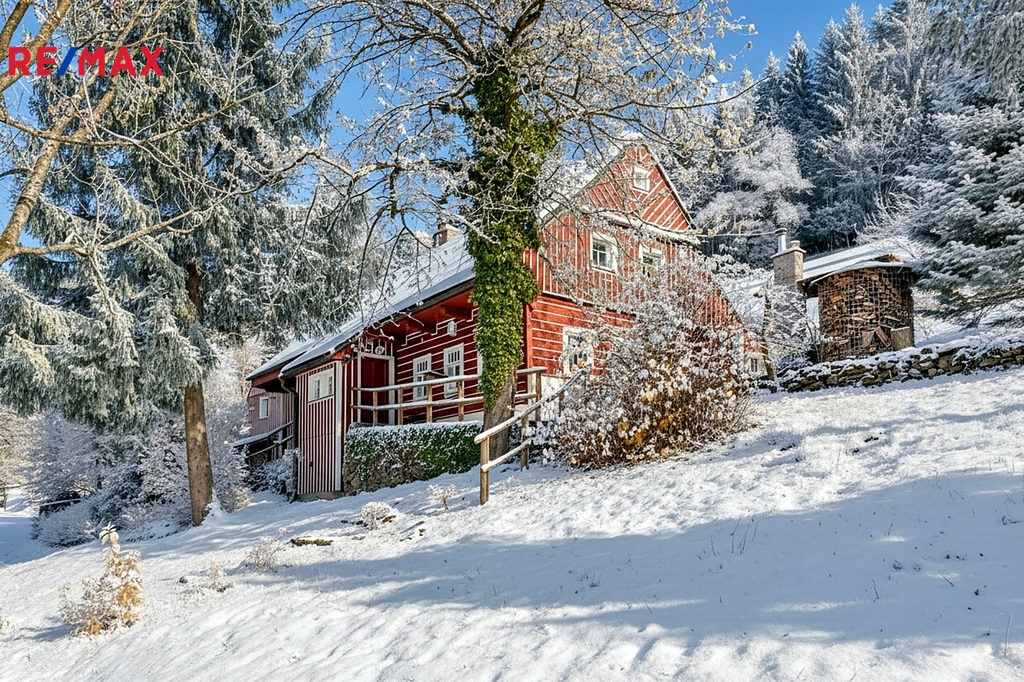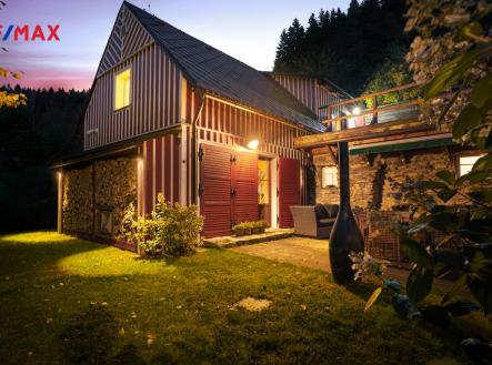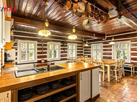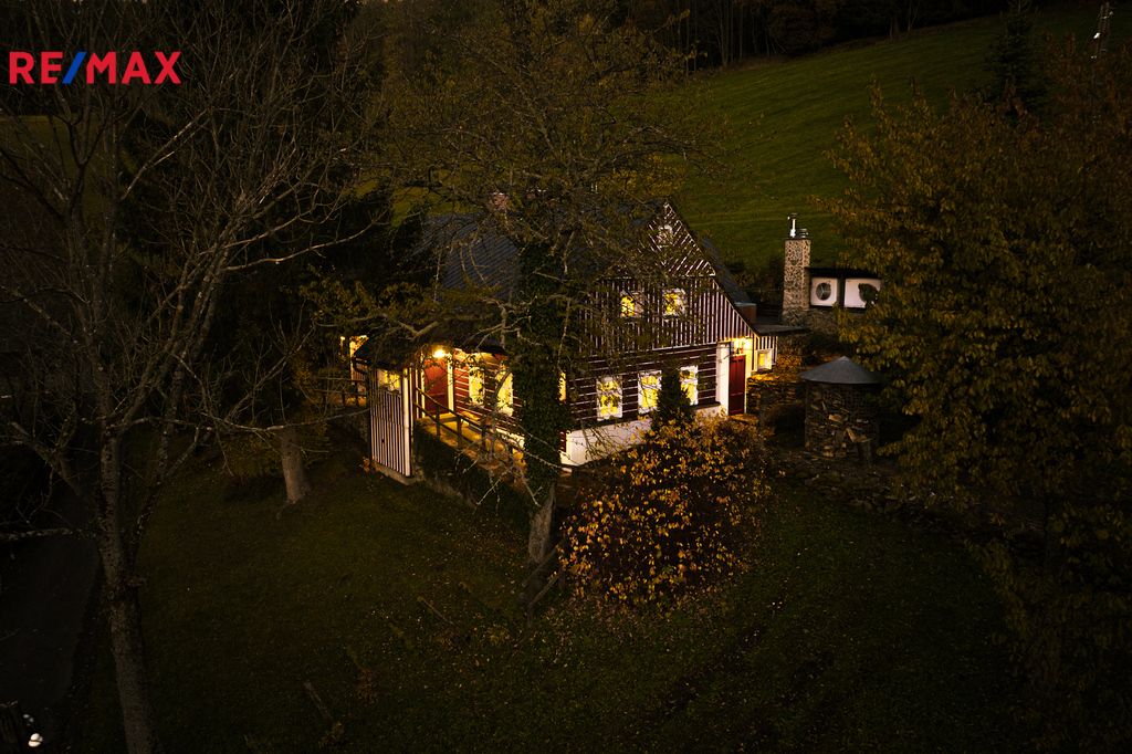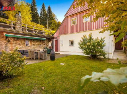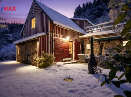 Hledáte místo, které spojuje absolutní soukromí, nádhernou přírodu Krkonoš a zároveň komfort moderního luxusu? Tato tradiční krkonošská chalupa po nákladné, rozsáhlé a precizní rekonstrukci splní očekávání těch nejnáročnějších zájemců. Nabízí dispozici 7+1 s příslušenstvím a velkorysou podlahovou plochu 383m2. V přízemí se nachází prostorná, do detailu vybavená obytná kuchyně s jídelnou, ideální pro velké rodinné setkání či přátelské posezení. Atmosféru dotváří krásná kachlová kamna a stylová replika místních stojacích hodin s původním strojkem. Součástí přízemí je i odpočinková místnost, využitelná i jako ložnice s vlastní koupelnou vybavenou špičkovou saunou KLAFS (finská sauna, saunarium, infrasauna) a parní sprchou KERAMAG AURA. Samozřejmostí je i samostatné WC. V zadní části domu se nachází moderní kotelna a původní kamenný sklep se stálou teplotou. Dispozici přízemí dále tvoří místnost s výjimečným atraktivním prvkem - přiznanou skalní stěnou, po níž jemně stékají pramínky vody. Další místnost, která je vybavená barem a elektrickým krbem zn. ELEMENT, tvoří společenskou část chalupy a navazuje na ní kinosál vybavený technikou B&W. Z této místnosti je vstup na spodní venkovní terasu. Nad tímto křídlem se nacházejí dvě ložnice s vlastní koupelnou a jedna je se vstupem na druhou vyvýšenou venkovní terasu, která je vybavená stylovým nábytkem EcoFurn, Solo Stove. Dominantou hlavní chodby chalupy je masivní dubové schodiště, v patře nad hlavní částí chalupy se nacházejí tři samostatné ložnice s vlastní koupenou. Dispozice chalupy tímto zajišťuje dostatek soukromí pro vícečlennou rodinu nebo početnější návštěvu. V interiéru naleznete řadu originálních i rekonstruovaných prvků tradičního krkonošského nábytku, které dodávají chalupě jedinečný charakter. Chalupa byla rekonstruovaná v roce 2006, s důrazem na kvalitu materiálů a dlouhodobou životnost. Měděné rozvody podlahového vytápění Rehau, speciální střešní krytina Capacco, designové vypínače a zásuvky Berker, dveřní kování ruční výroby. Vytápění zajišťují dvě tepelná čerpadla Stiebel Eltron, nechybí ani kotel na dřevo či možnost využít plyn (2t zásobník propan-butan). V chalupě jsou dvě rekuperace, dvě klimatizace Haier, bezpečností kamerový systém a vysokorychlostní DSL internet. Součástí komfortního vybavení je chytrý systém vytápění s možností dálkového ovládání přes internet. U domu se nacházejí tři venkovní terasy, hlavní je s venkovním krbem, v patře je terasa s ohništěm a třetí relaxační terasa s vířivkou HotSpring. Součástí je garáž pro 4 vozy. Chalupu obklopuje pozemek o velikosti 27.504m2, jedná se o jedno z nejzachovalejších krkonošských údolí, kde naleznete pouze původní chalupy a klid. Nemovitost stojí v klidné neprůjezdné části obce Horní Dušnice obklopená lesy a loukami. Nejbližší lyžařské středisko je Horní Rokytnice, kde se nově buduje nový špičkový lyžařský areál, přes kopec se nachází lokalita Vítkovice s nočním lyžováním a možností SkiAlpy přímo od chalupy.