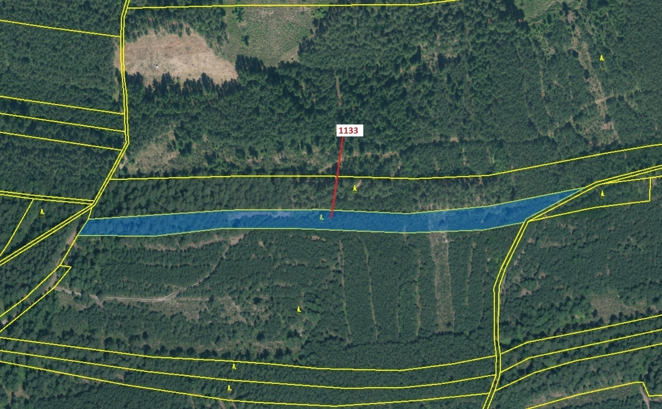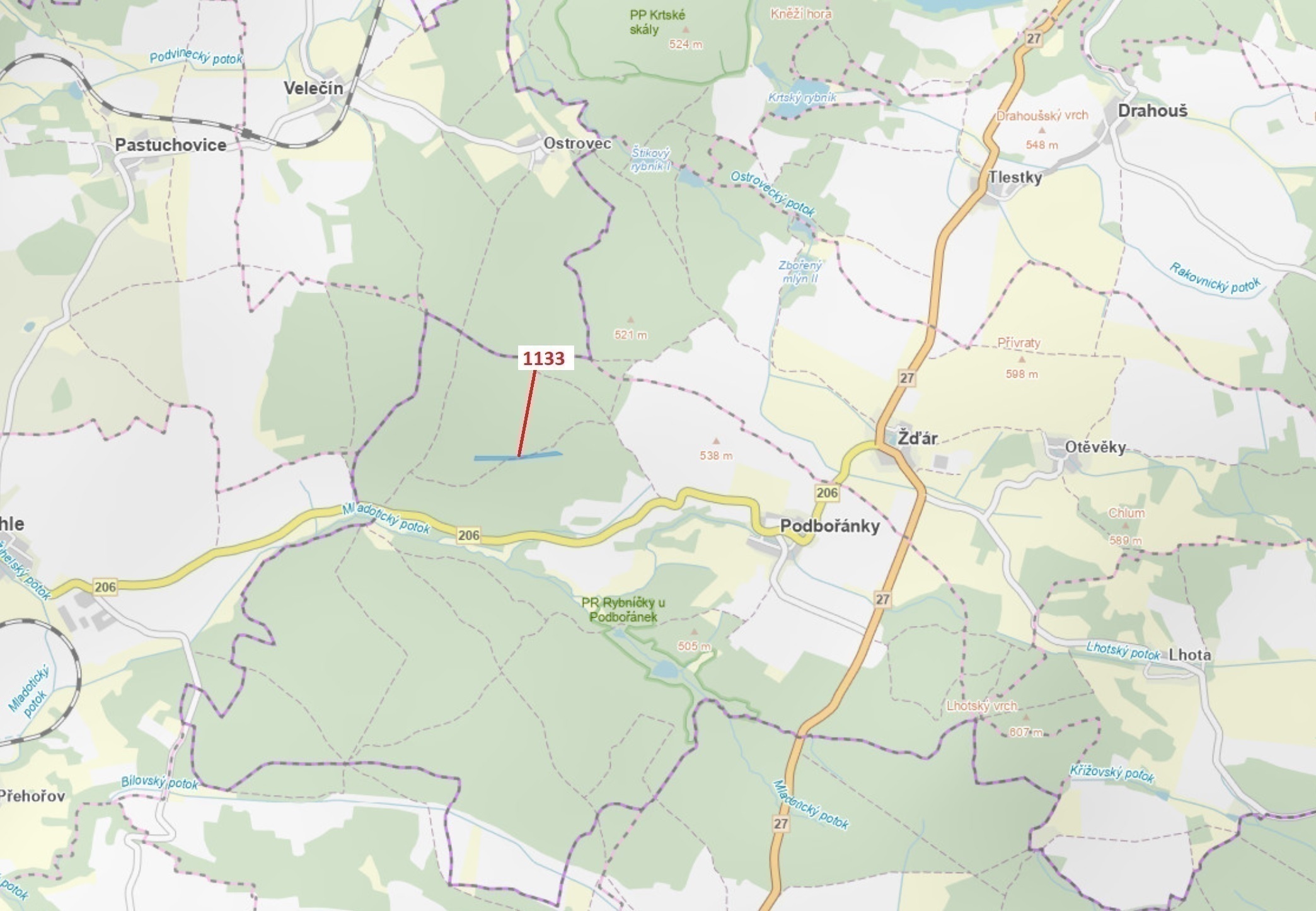 Lesní pozemek o výměře 7 895 m2, parcelní číslo 1133, podíl 1/1, katastrální území Podbořánky, obec Jesenice, obec s rozšířenou působností Rakovník, okres Rakovník, Středočeský kraj. Částečně po těžbě.