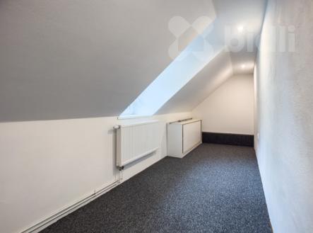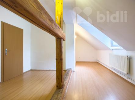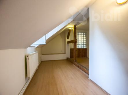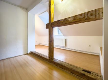 Nabízíme k prodeji velmi zajímavě řešený byt o dispozici 5+1, který se nachází v podkrovní části domu a poskytuje spoustu možností pro rekonstrukci i individuální úpravy. Byt se skládá z předsíně s prostorem pro vestavné skříně a velké kuchyně situované uprostřed dispozice, která tvoří přirozené srdce bytu. Kuchyň je prostorná, s dostatkem místa pro jídelní kout i další úložné prostory. Z kuchyně je vstup do jednotlivých pokojů, z nichž některé disponují střešními okny a šikminami, což bytu dodává podkrovní atmosféru. Velmi atraktivní je pokoj se zachovanými dřevěnými trámy, které opticky rozdělují prostor a dodávají mu jedinečný charakter. Hlavní obývací pokoj je velkoryse pojatý a navazuje na další pokoj se šikminou, který může sloužit například jako šatna, pracovna nebo dětský pokoj. V této části bytu je také možnost instalace krbových kamen. Byt má prostornou koupelnu s rohovou vanou, umyvadlem a elektrickým žebříkem. Samostatné WC je umístěno za koupelnou a disponuje přípojkou na pračku a sušičku. Topení řešeno rozvody do ústředního topení, vytápění a ohřev vody zajišťuje plynový kotel. V bytě jsou osazeny termostatické ventily a centrální termostat. Podlahy tvoří lino, dlažba, beton a plovoucí podlahy. Okna jsou plastová se sítěmi proti hmyzu a střešní okna. Střecha zateplená vatou a stříkanou pěnou. V domě je dostupný vysokorychlostní internet přes optický kabel. Byt se nachází v domě s dobrou dostupností a nabízí výborný poměr prostoru a variability pro budoucí využití. Ideální pro větší rodinu nebo pro klienty hledající netradičně řešené bydlení s možností doladění dle vlastních představ. K bytu náleží podíly na okolních pozemcích, kde je možné příjemné posezení pod vzrostlými stromy, popřípadě i parkování. K bytu náleží i půdní prostory o velikosti 38m2. Dům se nachází jen 5 minut pěší chůze od centra města Jeseník - krásného lázeňského města v srdci Jeseníků, ideálního pro milovníky přírody i wellness. V bezprostřední blízkosti jsou obchodní domy a Lidl, Billa.