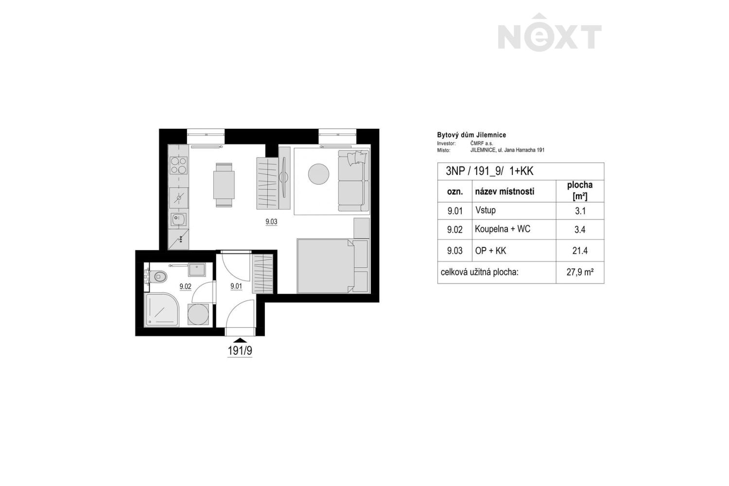 Prodej moderního bytu 1kk, 29 m², s parkovacím stáním v centru Jilemnice – pěší zóna ulice Jana Harracha. Nabízíme ke koupi garsoniéru a velikosti 29 m², s parkovacím stáním na pěší zóně ulice Jana Harracha v Jilemnici – městě právem označovaném jako „brána do Krkonoš“. Dispozice bytu č. 191_9 (dle prohlášení vlastníka): • Vstupní chodba: 3,1 m² • Obývací pokoj s kuchyňským koutem: 21,4 m² • Koupelna se sprchovým koutem vč. wc: 3,4 m² Vysoký standard bydlení Projekt „Bydlení Jilemnice“ kombinuje historický šarm budovy s nejnovějšími moderními prvky a je zde pouze 9 bytových jednotek (1kk až 3kk, 29–92 m²). Bytový dům je navržen s důrazem na moderní technologie a úsporný provoz – vytápění a ohřev vody zajišťuje nová centrální plynová kotelna, ve všech místnostech je instalováno komfortní podlahové topení s vinylovou podlahou. Byty jsou vybaveny moderními koupelnami a sanitou značky SIKO. Perfektní místo pro život Jilemnice nabízí kompletní občanskou vybavenost: mateřské a základní školy, renomované sportovní gymnázium, nemocnici, restaurace, obchody i pestré kulturní vyžití – kino, divadlo, společenský dům, festivaly i tradiční jarmarky. Aktivní životní styl po celý rok V okolí najdete nový biatlonový areál Hraběnka, krytý plavecký bazén, atletický i fotbalový stadion a budované přírodní koupaliště (biotop). Krkonošské turistické trasy a oblíbená lyžařská střediska (Benecko, Rokytnice, Horní Mísečky, Špindlerův Mlýn) jsou snadno dostupná autem během 25 minut. Další výhody: • K bytu náleží vlastní venkovní parkovací stání s přípravou pro elektro dobíjení. • Možnost zajištění výhodného financování včetně kompletní administrativní podpory. • Využijte i možnost družstevního financování bez prokazování příjmů, úvěr na 30 let v jakémkoliv věku. Prohlídky jsou možné po dohodě i o víkendu či svátcích. Neváhejte mě kontaktovat, ráda Vám všechny byty v novém projektu osobně ukážu. Pro komunikaci uvádějte evidenční číslo zakázky N113278.