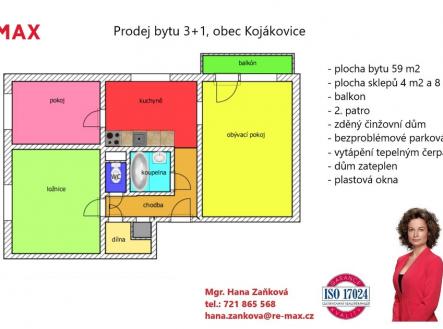 Prodej zděného bytu 3+1 v osobním vlastnictví s dvěma sklepy, balkonem a parkováním, obec Kojákovice