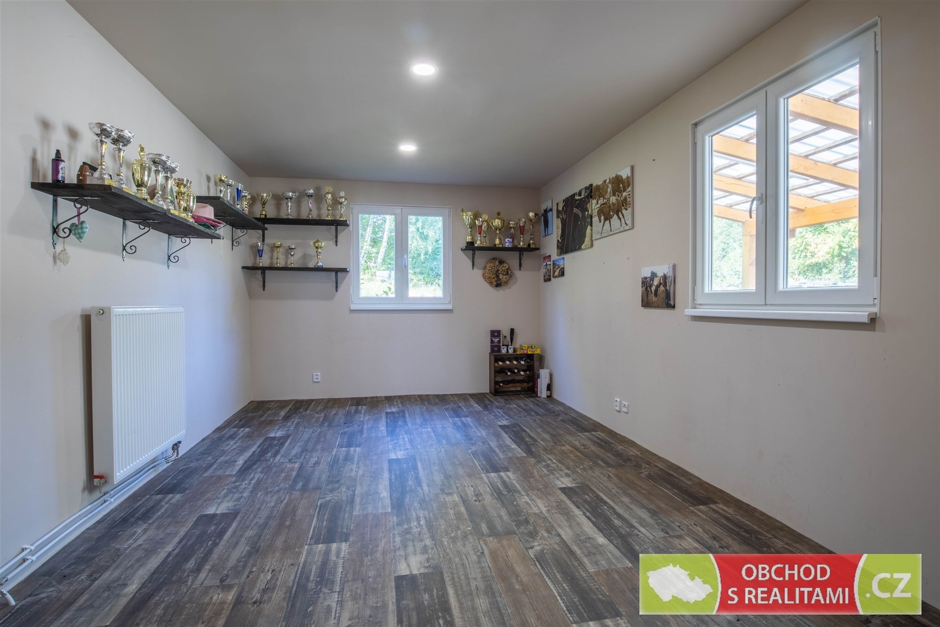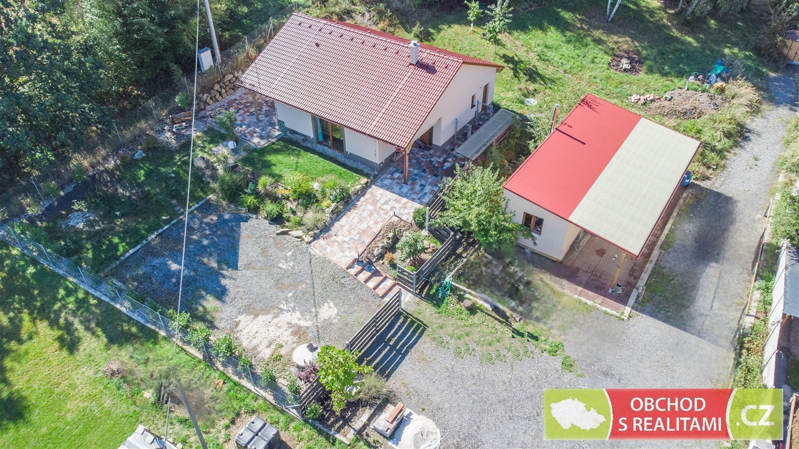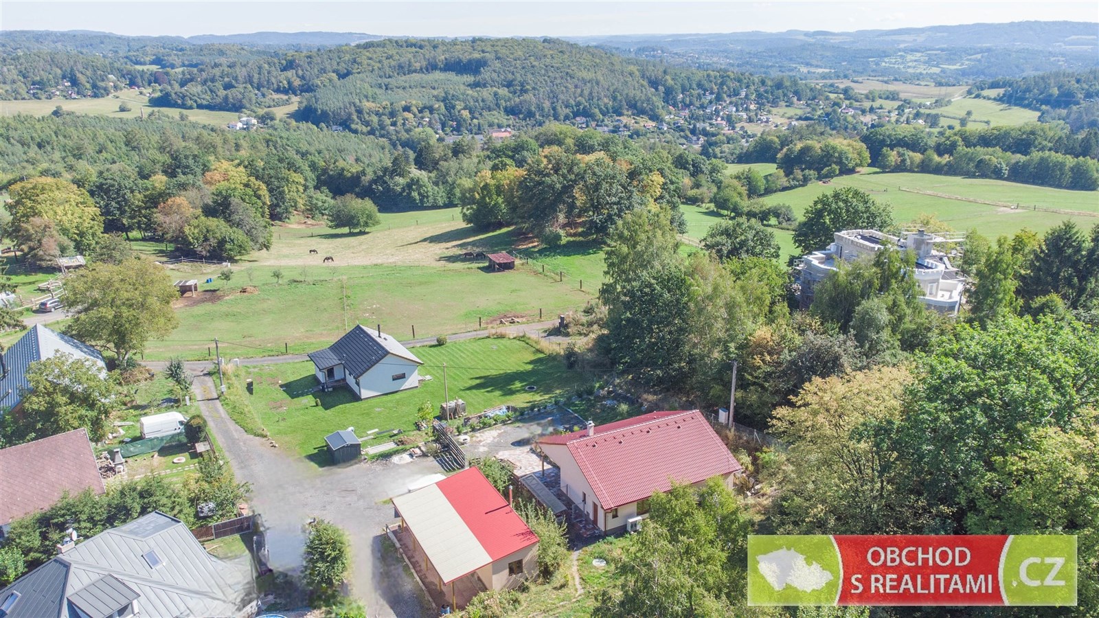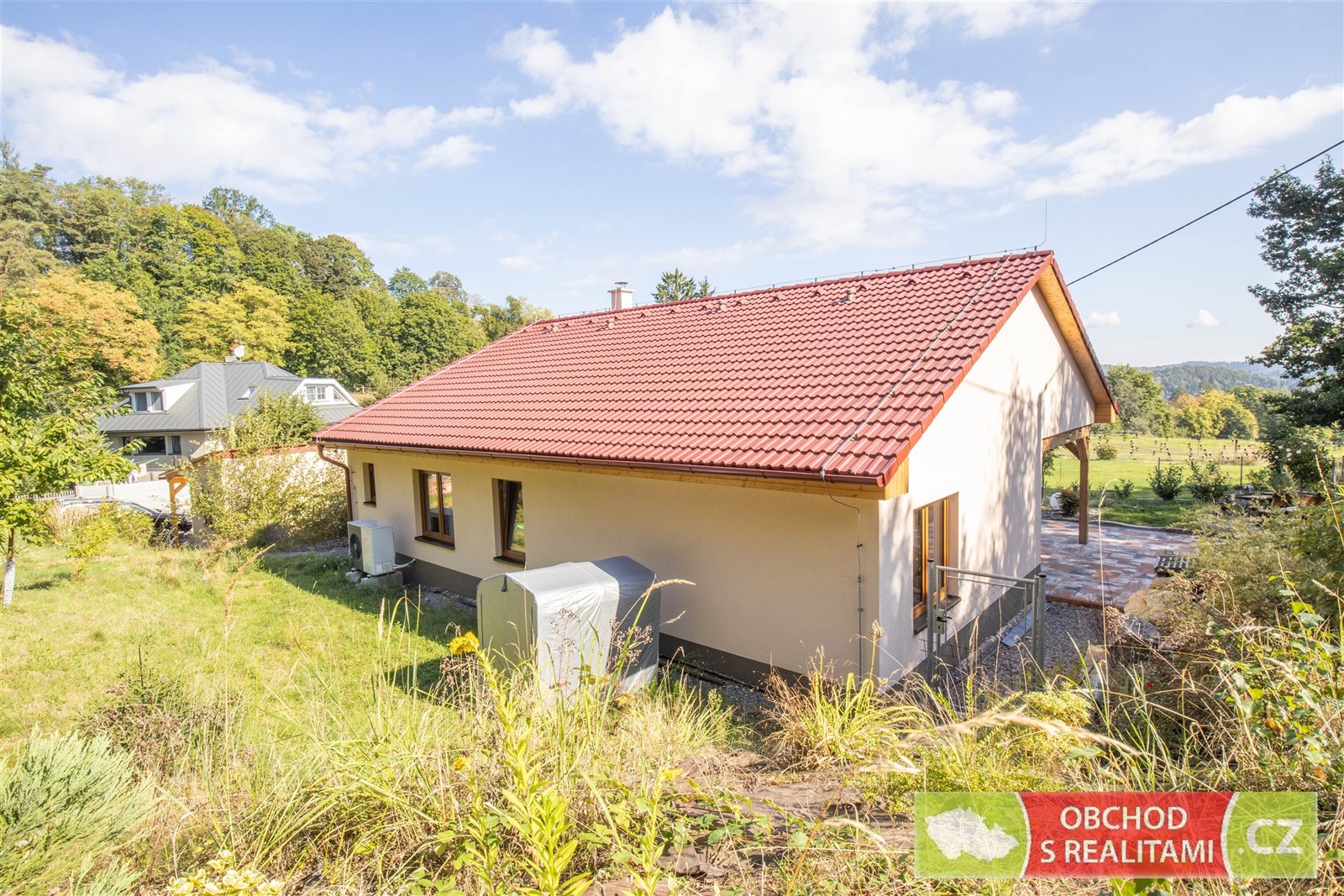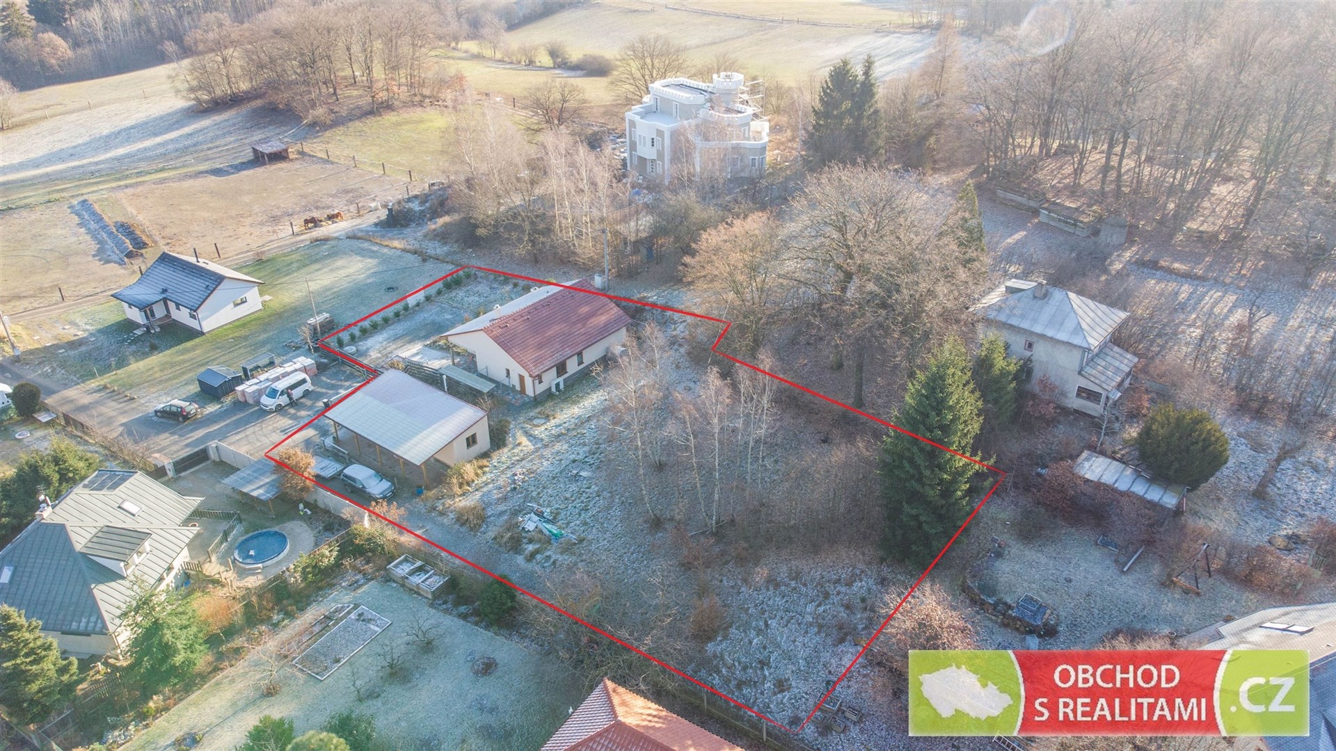 Rodinný dům se nachází na adrese Ládeveská 270, Ládeves (správu vykonává obec Kamenice). Celková výměra pozemku je 2.091 m2 (parcelní čísla 204/31 + 204/5 + st. 1365 + st. 1366, vše pro katastrální území Ládví). Na zahradě u rodinného domu je možné postavit další rodinný dům, když je zahrada dle územního plánu vedena v území nazvaném BR (bydlení a rekreace). Přípustná je výstavba rodinného domu s jednou bytovou jednotkou. K zahradě tak byla v minulosti zpracována studie na zástavbu přízemním rodinným domem 4+KK s garáží (půdorysné řešení Vám můžeme zaslat k nahlédnutí). Společně s rodinným domem tak nabýváte zahradu s možností okamžité / budoucí výstavby dalšího rodinného domu! Ládeves je osadou rodinných domů užívaných k trvalému bydlení. Je velmi dobře dopravě dostupná po tzv. Staré Benešovské, tedy od Prahy směr Jesenice, Kamenice, Ládví nebo po dálnici směr Velké Popovice a dále směr Štiřín. Osada je obklopena lesní oborou Vlková s nejvyšším bodem Vlková 521 m.n.m. V těsném sousedství jsou rodinné domy užívané k trvalému bydlení nebo pastviny pro koně, což je pro toto místo typické. Též z terasy rodinného domu je volný výhled přes pastviny a údolí na zalesněné kopce Středočeského kraje. Jedná se o velmi klidné místo s minimem dopravy, není zde veřejné osvětlení, a tak i světelného smogu je zde minimum. Výstavba rodinného domu byla dokončena v roce 2023. Dřevostavba vystavěná v energetické třídě A nabízí dispozici 3+KK s užitnou plochou 102 m2. Dispoziční plán domu přikládáme do fotodokumentace této inzerce. Promyšlená dispozice obsahuje technickou místnost, spíž i šatnu, tedy dostatek úložných prostor mimo obytné místnosti; dále obsahuje obývací pokoj 46 m2 s francouzským oknem a výhledem do krajiny; součástí jsou dvě koupelny, ta první se nachází u ložnic, ta druhá je přístupná ze zahrady (při pobytu venku máte k dispozici sprchový kout i WC). V celém domě je příjemné podlahové topení, v obývacím pokoji je možné topit též kamny. Dále se na pozemku nachází samostatná stavba hobby domku, která obsahuje dvě místnosti, každá s výměrou 20 m2. Na hobby domek navazují krytá parkovací stání. I tato stavba je napojena na rozvod topení z tepelného čerpadla, a tak je možné místnosti temperovat, případně je k dispozici komínové těleso s kamny. Roční vyúčtování spotřeby elektřiny dokládá spotřebu 3.000 Kč / měsíc (kompletní energetická náročnost = vytápění, ohřev užitkové vody, svícení, vaření a další běžná spotřeba rodinného domu užívaného k trvalému bydlení). Kamna v obývacím pokoji byla využívána jen občas, vytápění domu v zimních měsících tedy nebylo za pomoci tuhých paliv. Přípojka elektrické energie s jističem 3 x 25 A, odpad je vyřešen čistírnou odpadních vod s retenční nádrží a voda je čerpána z vlastní vrtané studny (případně lze uvažovat o připojení na nedaleký vodovodní řad). Nemovitost ve vlastnictví jediného vlastníka, bez právních omezení (též bez hypotečního úvěru), po prodeji volná k nastěhování.