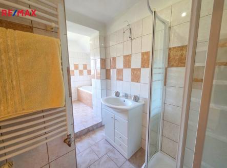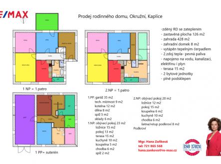 Nabízíme krásný rodinný domek z roku 1977 s dvěma bytovými jednotkami, s terasou, zahradou a garáží, v klidné části Kaplice, v blízkosti přírody. Zděný dům se sedlovou střechou (zastavěná plocha 126 m2) je osazen v mírném svahu, má dvě nadzemní a jedno podzemní podlaží. Kolem domu se rozkládá udržovaná zahrada o ploše 428 m2, v rohu zahrady je zahradní domek. V přízemí rodinného domu se nachází předsíň (9 m2) ze které se vchází do bytu v přízemí o dispozici 3+1; na schodiště k druhému bytu v patře nebo do suterénu domu. Do bytu v přízemí (1.NP) se vchází chodbou, ze které je přístup do téměř všech místností. Byt má oddělené WC, koupelnu (5 m2) s vanou a sprchovým koutem, umyvadlem se zrcadlem, otopným žebříkem a pračkou; kuchyni (10 m2) se spíží; obývací pokoj (23 m2); ložnici (15 m2) a pokoj s přístupem na zastřešenou terasu (13 m2). Do bytu v patře (2.NP) je přístup po zděném schodišti. Byt má dispozici 3+1 a skládá se z velké koupelny (6 m2) s vanou, sprchou, otopným žebříkem, umyvadlem a WC; kuchyně (10 m2) s důmyslně schovanou spíží; obývacího pokoje (20 m2); ložnice (12 m2) a pokoje (15 m2). Z úzké šatny v 2.NP je přístup výsuvnými schůdky do podkroví, kam byla vyvedena elektřina, voda i kanalizace. Suterén se nachází pod celým domem a skládá se z velké garáže (35 m2), dílny (8 m2), technické místnosti (9 m2), skladů (6 m2) a kotelny (12 m2). V jedné místnosti vybudováno sociální zařízení (WC, umyvadlo). Vše rozkresleno v plánku. Dům je částečně vybaven. Okna mají vnitřní žaluzie. Před domem vedle garáže je vybudován dřevěný přístřešek. V zadní části zahrady je zděný zahradní domek (8 m2). Dům je napojen na obecní vodu a kanalizaci, elektrickou síť a do domu je zaveden plyn (plyn se již neužívá). Dům je vytápěn tepelným čerpadlem a kotlem na tuhá paliva. Zděný dům je zateplen polystyrenem. Ulice před domem je nově zrekonstruována včetně výměny veškerého vedení. Energetický štítek ve zpracování. Předností této nemovitosti je krásná poloha, udržovaná zahrada a komplexní občanská vybavenost. Dům doporučuji těm, kteří chtějí bydlet komfortně, ve vlastním a kvalitně provedeném domě a hledají klidné místo v dosahu města. Dětské hřiště 100 m, škola 250 m včetně sportovní haly. V případě více zájemců bude upřednostněna vyšší nabídka.
