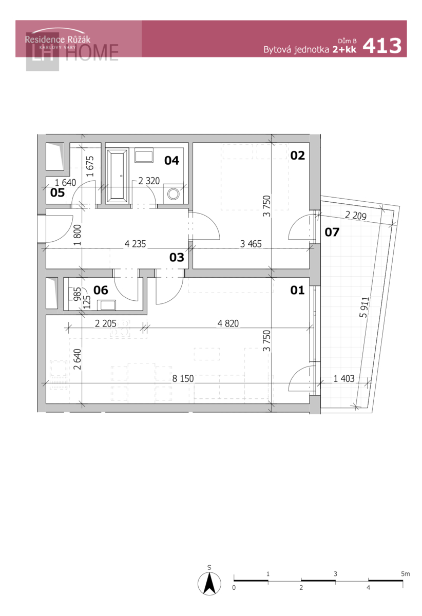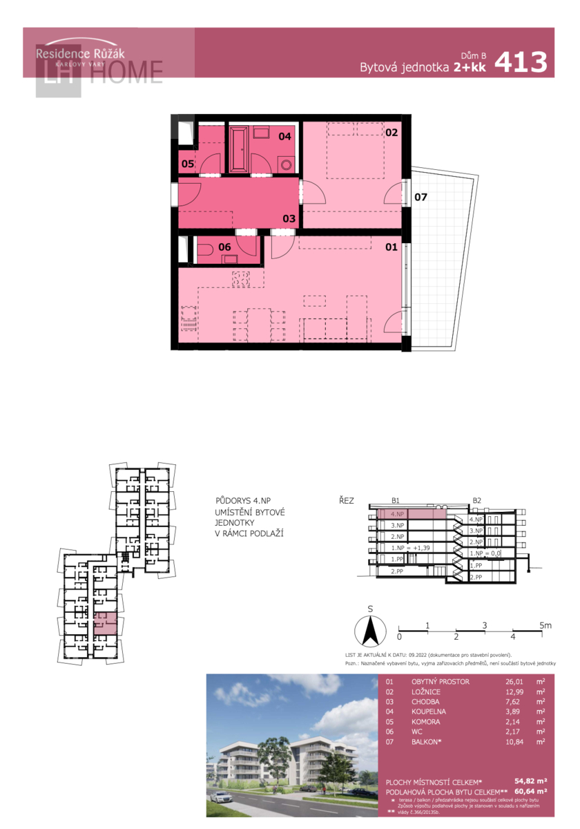 Byt 2+kk, 60,64 m2 + balkón 10,84 m2, Residence Růžák budova B