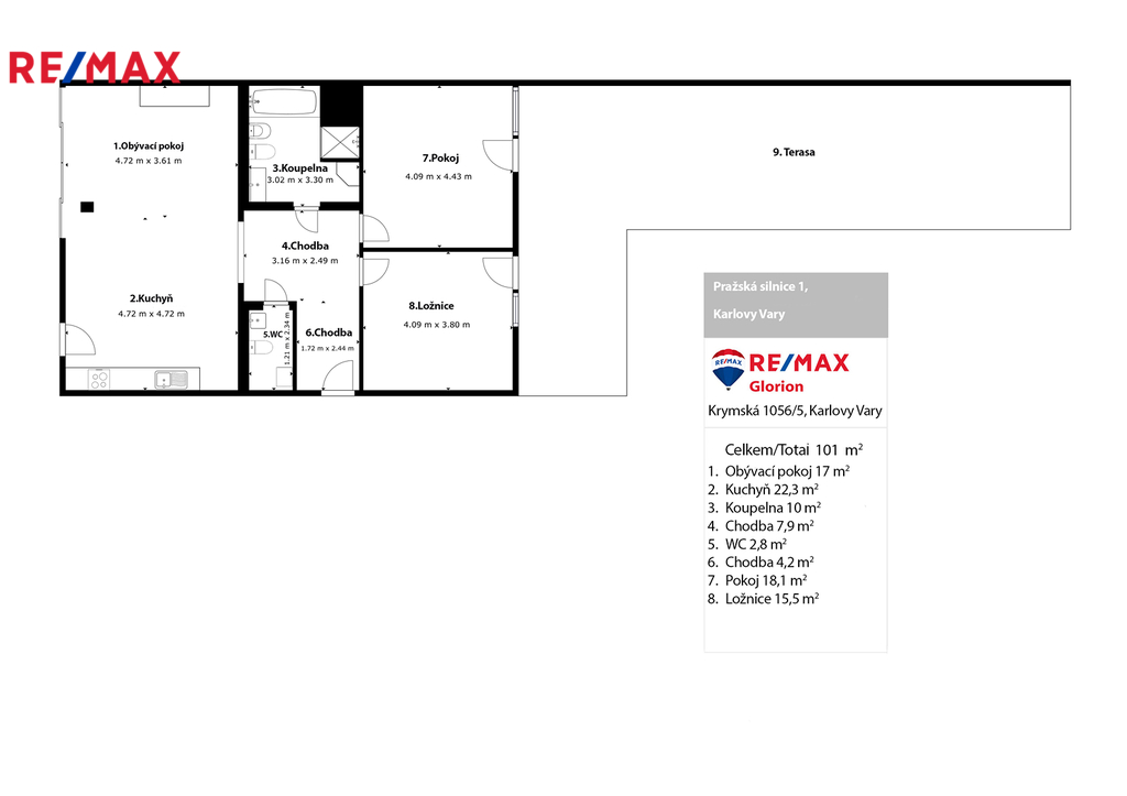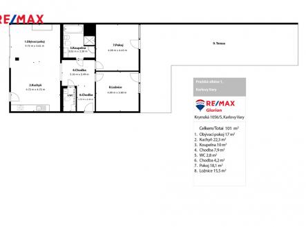 Nabízíme k prodeji prostorný a moderní byt 3+kk o rozloze 99 m2 nacházející se na Pražské ulici s jedinečným výhledem na Imperial. Tento byt je ideální volbou pro ty, kteří hledají komfortní a elegantní bydlení v klidné, ale dobře dostupné lokalitě. V těsné blízkosti se nachází zastávka MHD, škola, školka, obchod z potravinami, Lanovka Imperial, která vás pohodlně dopraví do historického centra města - Kolonádě. Byt se nachází v novostavbě z roku 2010 a nabízí moderní interiér s kvalitními materiály. Dominantou bytu je německá kuchyňská linka a nábytek. Podlahy pokrývá kvalitní parkety, kteří dodává interiéru útulnou atmosféru. Díky francouzským oknům je byt krásně prosvětlený a nabízí úžasný výhled. Pro ještě větší komfort jsou okna vybavena žaluziemi, které chrání byt před přehříváním a umožňují regulovat množství denního světla podle potřeby. Velkou výhodou bytu jsou dva samostatné koupelny, které zajišťují komfort a pohodlí pro celou rodinu. Hlavní perlou tohoto bytu je však prostorná terasa, která nabízí dostatek místa pro relaxaci, grilování nebo pěstování rostlin. Dům má vysoký standard zabezpečení – vstup do budovy, výtahu i garáží je možný pouze na čip. K bytu náleží také soukromé parkovací místo přímo v domě, což je v této lokalitě velkou výhodou. Pokud hledáte moderní bydlení s velkým venkovním prostorem, nádherným výhledem a vysokým standardem bezpečnosti, tento byt je ideální volbou. Neváhejte nás kontaktovat pro více informací nebo domluvení prohlídky!