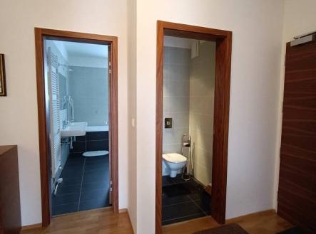 Pěkný byt 3+kk s nádherným výhledem na okolí, 2 garážové stání, v Karlových Varech Exkluzivně nabízíme k prodeji krásný a světlý byt 3+kk o celkové ploše 116,8 m², se dvěma balkony a výhledem na okolí, v Karlových Varech. Nemovitost se nachází ve 5. patře moderního bytového domu s výtahem. K bytu náleží dvě parkovací stání v podzemní garáži. Byt se skládá z prostorné vstupní haly, která spojuje všechny místnosti. Obývací pokoj s kuchyňským koutem, dvě koupelny s WC, samostatná toaleta, ložnice a pracovny. Prosvětlený a vzdušný obývací pokoj s přístupem na balkon nabízí pohodlné místo k relaxaci s jedinečným výhledem. Prostorná ložnice disponuje malým balkonem, vlastní šatnou a koupelnou se sprchovým koutem a WC. Druhý pokoj je pracovna s velkými okny a nádherným výhledem, ideální pro klidné chvíle odpočinku. Tento pokoj lze přetvořit na dětský pokoj nebo druhou samostatnou ložnici. V celém bytě je klimatizace. Byt je v dobrem stavu a nabízí vše, co by si kupující mohl přát. Rezidence byla dokončena jako moderní bezbariérový bytový komplex. Díky výborné poloze máte veškeré služby a občanskou vybavenost na dosah. Rezidence je ideálním místem pro ty, kteří ocení pěší dostupnost ke kulturním památkám, léčivým pramenům a přírodním krásám. Milovníci sportu ocení blízkost golfových hřišť, upravené cyklostezky a turistické trasy v celém Karlovarském kraji. Ve městě se nachází vlakové i autobusové nádraží, které poskytuje komfortní dopravu do mnoha českých i německých měst.