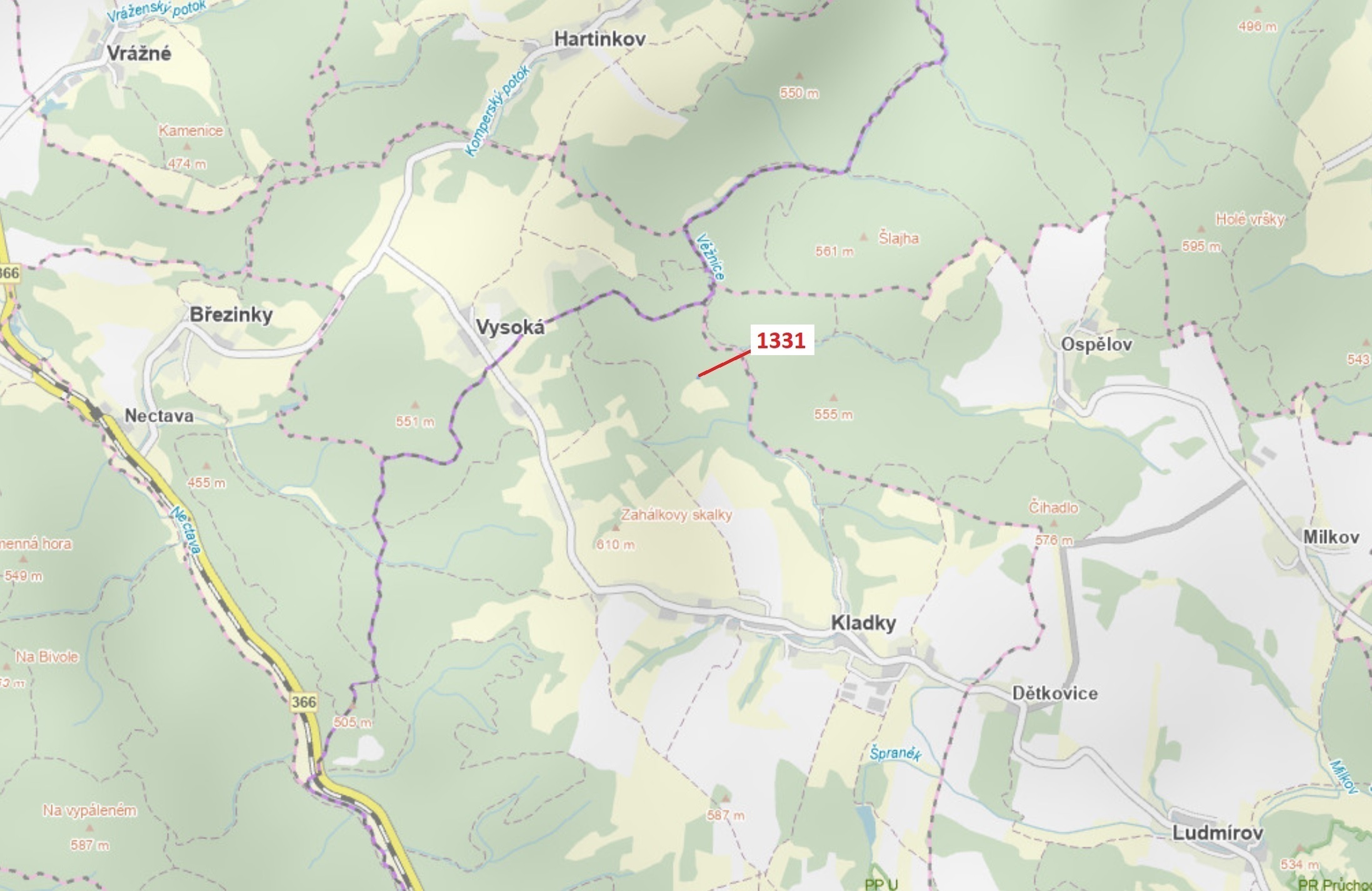 Lesní pozemek o výměře 183 m2, parcelní číslo 1331, podíl 1/1, katastrální území Kladky, obec Kladky, obec s rozšířenou působností Konice, okres Prostějov, Olomoucký kraj.