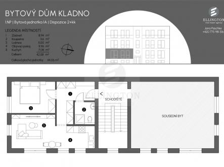 Tímto bychom vám chtěli nabídnout byt 1+kk o celkové rozloze 44m2, který je součástí 6-ti bytů v rezidenčním projektu and #34;U zámku and #34; v Zádušní ul. Kladno, který se nachází přímo v centru Kladna, v klidné části mimo hlavní silnici. Kousek od domu je Kladenský zámek s nově zrekonstruovanou zámeckou zahradou, která nabízí klidné místo k procházkám a relaxaci, dále historické Náměstí starosty Pavla s dominantním kostelem Nanebevzetí Panny Marie, mariánským sousoším a budovu magistrátu. Samotné náměstí tvoří živé centrum s obchody a restauracemi. Pouhých 5 minut od objektu je moderní nákupní centrum centrál Kladno s širokou nabídkou obchodu a služeb. Milovníci kultury pak mají možnost navštívit městské divadlo Kladno, divadlo lampion, zámeckou galerii a muzea. Pro odpočinek a sportovní aktivity slouží nedaleký park lesík, přírodní park sítenské údolí, sportovní areál sletiště s atletickým oválem, a dalšími sportovišti. Kladno je obklopeno lesy a cyklistickými stezkami, má také výbornou dopravní dostupnost do Prahy i okolních měst a obcí. Autobusové nádraží je vzdáleno 600 metrů, železniční zastávka Kladno je asi 1,5 km, dostupná přímo autobusem. Kolaudace celého projektu je naplánovaná na podzim roku 2026. Ke každé bytové jednotce je možnost po dobu 5ti let pronajmout za částku 200.000,- Kč venkovní parkovací. K bytům je možnost dokoupení sklepů od 2m2 6m2. Vybavení zahrnuje kvalitní vinylové podlahy, designové keramické obklady a dlažby ,plastová okna s izolačním trojsklem, kvalitní sanitu s bateriemi.. Vytápění a ohřev vody bude zajišťovat tepelné čerpadlo. Vnitřní provedení je možné ještě zvolit podle vašeho individuálního výběru (podlahové krytiny, obklady, dlažby, sanitární keramika, dveře a zárubně). , které je součástí ceny. Včetně půdorysu. Viz fotografie.