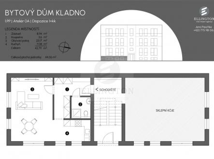 Tímto bychom vám chtěli nabídnout byt 1+kk - ateliér o celkové rozloze 44m2, který je součástí 6-ti bytů v rezidenčním projektu U zámku v Zádušní ul. Kladno, který se nachází přímo v centru Kladna, v klidné části mimo hlavní silnici. Kousek od domu je Kladenský zámek s nově zrekonstruovanou zámeckou zahradou, která nabízí klidné místo k procházkám a relaxaci, dále historické Náměstí starosty Pavla s dominantním kostelem Nanebevzetí Panny Marie, mariánským sousoším a budovu magistrátu. Samotné náměstí tvoří živé centrum s obchody a restauracemi. Pouhých 5 minut od objektu je moderní nákupní centrum centrál Kladno s širokou nabídkou obchodu a služeb. Milovníci kultury pak mají možnost navštívit městské divadlo Kladno, divadlo lampion, zámeckou galerii a muzea. Pro odpočinek a sportovní aktivity slouží nedaleký park lesík, přírodní park sítenské údolí, sportovní areál sletiště s atletickým oválem, a dalšími sportovišti. Kladno je obklopeno lesy a cyklistickými stezkami, má také výbornou dopravní dostupnost do Prahy i okolních měst a obcí. Autobusové nádraží je vzdáleno 600 metrů, železniční zastávka Kladno je asi 1,5 km, dostupná přímo autobusem. Kolaudace celého projektu je naplánovaná na podzim roku 2026. Ke každé bytové jednotce je možnost po dobu 5ti let pronajmout za částku 200.000,- Kč venkovní parkovací. K bytům je možnost dokoupení sklepů od 2m2 6m2. Vybavení zahrnuje kvalitní vinylové podlahy, designové keramické obklady a dlažby ,plastová okna s izolačním trojsklem, kvalitní sanitu s bateriemi.. Vytápění a ohřev vody bude zajišťovat tepelné čerpadlo. Vnitřní provedení je možné ještě zvolit podle vašeho individuálního výběru (podlahové krytiny, obklady, dlažby, sanitární keramika, dveře a zárubně). , které je součástí ceny. Včetně půdorysu. Viz fotografie.
