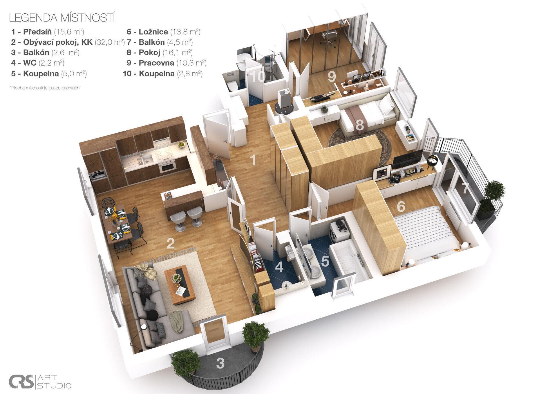 Nabízíme k prodeji výjimečně prostorný a velmi dobře dispozičně řešený byt o dispozici 4+1 a celkové výměře 97 m², který se nachází ve 2. patře v bytovém domě, Kladno - Ostrovec. Byt je ideální volbou pro rodinu, která hledá dostatek prostoru, soukromí i praktické uspořádání místností. Díky dvěma koupelnám a odděleným zónám je nemovitost vhodná i pro dvougenerační bydlení. Dispozice Srdcem bytu je obývací pokoj s kuchyňským koutem o ploše 32 m², který působí vzdušně a přirozeně propojuje společenskou část bytu. Bez problémů zde vytvoříte plnohodnotnou jídelnu i pohodlný obývací prostor. Velká okna zajišťují dostatek denního světla a přímý vstup na balkon (2,6 m²) nabízí příjemné místo pro relaxaci. Na obývací prostor navazuje vstupní hala/předsíň (15,6 m²), která poskytuje dostatek prostoru pro vestavěné skříně, botníky i další úložná řešení. Z této centrální části je přístup do všech místností, což zajišťuje maximální soukromí jednotlivých členů domácnosti. Klidová část bytu je tvořena třemi samostatnými neprůchozími pokoji: Hlavní ložnice (13,8 m²) – příjemný klidný prostor se vstupem na druhý, větší balkon (4,5 m²), ideální pro ranní kávu nebo večerní odpočinek Pokoj (16,1 m²) – vhodný jako dětský pokoj, pokoj pro hosty nebo plnohodnotná ložnice Pracovna (10,3 m²) – ideální pro home office, hobby místnost nebo další pokoj pro člena rodiny Velkým benefitem jsou dvě koupelny (5,0 m² a 2,8 m²), které umožňují komfortní fungování vícečlenné domácnosti – jednu lze využít jako hlavní rodinnou koupelnu a druhou například jako zázemí pro hosty nebo druhou generaci. Samozřejmostí je také samostatné WC (2,2 m²). Celková dispozice je velmi promyšlená – byt působí vzdušně, logicky navazuje a nabízí dostatek úložných prostor i soukromí. Technický stav, vybavení Byt je ve velmi dobrém technickém stavu a umožňuje okamžité bydlení bez nutnosti zásadních investic. Instalována nová okna, vlastní plynový kotel a samostatný ohřev teplé vody – plná kontrola nad spotřebou a náklady. Dům má novou střechu, která je již kompletně uhrazena z vlastních prostředků. Bezproblémové a pohodlné parkování před domem. Náklady: předpis do SBF: 6 154 Kč / měsíc Zálohy na plyn, vodu a elektřinu budou sděleny na vyžádání. Díky vlastnímu vytápění a ohřevu vody má majitel plnou kontrolu nad náklady domácnosti. Lokalita Byt se nachází v příjemné a vyhledávané části města Kladno – Ostrovec. Tato lokalita je oblíbená především díky klidnému prostředí, zeleni a rodinné atmosféře, která je ideální pro každodenní život. V docházkové vzdálenosti naleznete kompletní občanskou vybavenost – mateřské i základní školy, obchody, dětská hřiště i sportoviště. Velkou výhodou je dostupnost: - centrum Kladna cca 10 minut pěšky, výborné vlakové spojení do Prahy, ideální pro každodenní dojíždění. Lokalita tak nabízí ideální kombinaci klidného bydlení v zeleni a rychlé dostupnosti města i hlavního města.