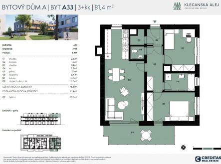 Dovolujeme si vám nabídnout byt 3+kk o celkové výměře 81 m², umístěný ve 3.NP, který je součástí projektu Klecanská alej nedaleko od hlavního města. Projekt se nachází v ulici Topolová v Klecanech, které jsou nejmenším městem v okrese Prahavýchod a nachází se 5 km severně od okraje hlavního města Prahy na pravém břehu Vltavy. Život v Klecanské aleji vám přinese bydlení v klidném a moderním prostředí, krásnou okolní přírodu včetně řeky a dobrou občanskou vybavenost. Klecany nabízí díky hlavnímu tahu E55 výborné automobilové napojení do hlavního města. Zastávka MHD je tři minuty chůze od projektu a za 15 minut vás autobus dopraví na pražské metro Kobylisy. V obci funguje také přívoz Klecánky – Roztoky u Prahy, takže se rychle přepravíte na druhou stranu Vltavy. Projekt představuje 31 samostatně stojících budov typu vila, rodinný dům, rodinný řadový dům a 37 bytových jednotek 1+kk 4+kk. V projektu je kladen důraz na promyšlené dispoziční uspořádání interiérů, úložné prostory, dostatek parkovacích stání a zeleň. Plánované dokončení projektu 4.Q 2026. Uvedená cena zahrnuje venkovní žaluzie. K bytu je možné přikoupit venkovní parkovací stání či sklep. Jednotková cena stání je 300 000 Kč vč. DPH. Cena sklepu je dle velikosti, jednotková cena je 33 600 Kč/m2 vč. DPH. V případě zájmu nás neváhejte kontaktovat. Prodej přímo od majitele. Více informací o tomto bytu a kompletní nabídce najdete na webu creditasre.