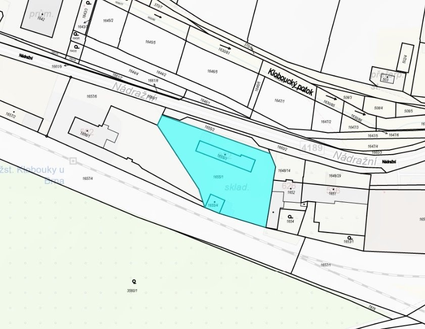Prodej výrobně skladovací areálu, užitná plocha 263 m2, celková plocha pozemků 2124 m2, Klobouky u Brna Jedná se o výrobně-skladovací areál se stávajícími budovami: administrativní budova s kancelářemi a sociálním zázemím, navazující sklady, dílna, garáže, přístřešky; zpevněnou a manipulační plochou a doplňkovými stavbami, to vše nacházející se na pozemcích uvedených na LV č. 507 v k.ú. Klobouky u Brna. Prodej probíhá transparentně formou elektronického výběrového řízení. Více informací k dispozici na: www.verejnedrazby.cz/A7901 Jde o areál, který dle platného územního plánu spadá do funkčních ploch – území smíšená – SV plochy smíšené výrobní. Areál tak má potenciál případné budoucí výstavby – např. podmíněně přípustné rodinné domy a byty pro správce, majitele, zaměstnance. Průjezdný areál s mostovou váhou je situován v těsné blízkosti komunikace s veškerými inženýrskými sítěmi, v okrajové části obce Klobouky u Brna, na ulici Nádražní. Je oplocen, napojen na elektřinu a disponuje vlastní studnou. Vytápění administrativní budovy je řešeno kamny na tuhá paliva a přímotopy. Odpadní vody jsou svedeny do kanalizace. Samostatné měřidlo na elektřinu. Přípojka na internet. Vodovodní řad a vedení plynu v komunikaci před areálem. Dispozice (místnosti): kancelář 1 12,00 m2 kancelář 2 22,75 m2 WC + předsíňka 3,15 m2 obslužná místnost k váze 6,13 m2 sklad 1 20,14 m2 sklad 2 20,28 m2 WC 1,02 m2 garáž (menší) 13,38 m2 garáž (velká)/dílna 57,12 m2 dřevník 5,70 m2 plechová dvojgaráž 52,26 m2 dřevěný přístřešek 29,58 m2 zděný přístřešek (samostatná garáž) 20,13 m2 Vjezd do objektu je možný dvěma vjezdovými branami směrem od hlavní silnice. Šíře hlavní brány 5,30 m. Funkční rozdělení ploch: Administrativní, skladová (výrobní) užitná plocha se zázemím činí: cca 263,64 m2 Zastavěná plocha budov zapsaných v KN: 273 m2 Manipulační plocha včetně přístřešků činí cca 1800 m2 Celková výměra pozemků činí 2.124 m2 Adresa: Nádražní 822/90, 691 72 Klobouky u Brna Pro více infrormací nás neváhejte kontaktovat - děkujeme.