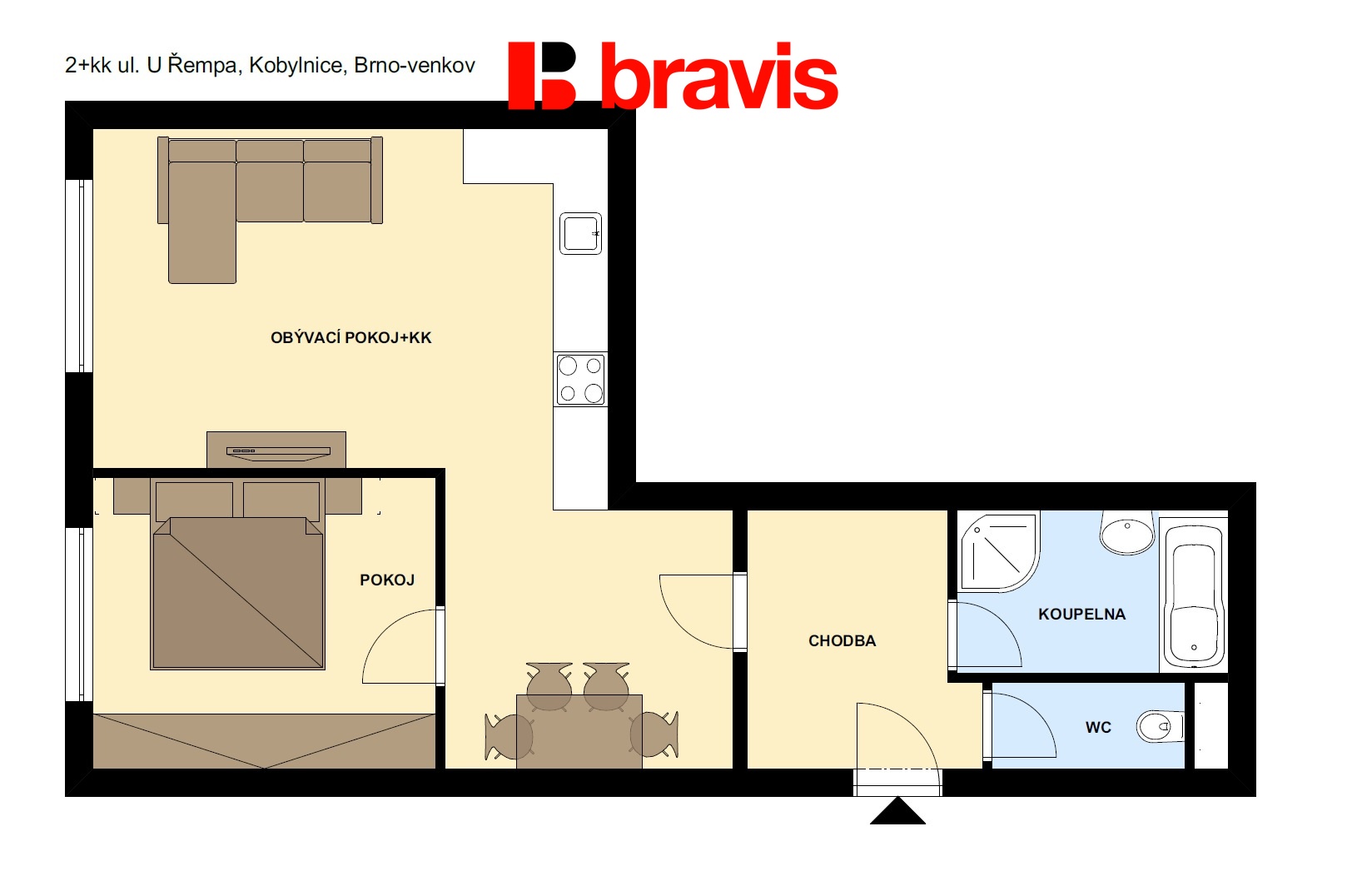 Ve výhradním zastoupení majitele nabízíme k pronájmu kompletně zařízený, slunný byt 2+kk s balkonem v obci Kobylnice na ulici U řempa. Byt se nachází ve 2.patře bytového domu s výtahem. Celková plocha bytu je 60m2. K bytu náleží vyhrazené parkovací stání. Kuchyně je vybavena novou linkou na míru se spotřebiči (lednice s mrazákem, myčka, trouba, mikrovlnná trouba, digestoř, varná deska) a jídelním stolem se židlemi. Obývací část pokoje je zařízena sedací soupravou, konferenčním stolkem, obývací stěnou a TV. V ložnici se nachází manželská postel, noční stolky a šatní skříň. Koupelna je vybavena vanou, sprchou, umyvadlem a pračkou. Toaleta je samostatně. Byt je vybaven venkovními elektrickými žaluziemi. Možnost připojení internetu. Prohlídky možné od 20.1.2026. Z obce jezdí pravidelné spoje MHD, do centra Brna se tak dostanete cca za 30 minut a autem za 20 minut. Přímo v obci Kobylnice se nachází ZŠ a MŠ. V blízké obci Šlapanice (autem cca 8 minut, autobusem č.151 za cca 5 minut) je veškerá občanská vybavenost. Nachází se zde banka, bankomat, pošta, cukrárny a restaurace, lékaři, supermarket Albert, Penny Market. Prohlídky možné po domluvě s níže uvedeným makléřem. V případě Vašeho zájmu Vám můžeme nabídnout video-prohlídky nemovitostí v přímém přenosu bez osobního kontaktu. Možnost zajištění jednorázového či pravidelného úklidu naší úklidovou firmou.