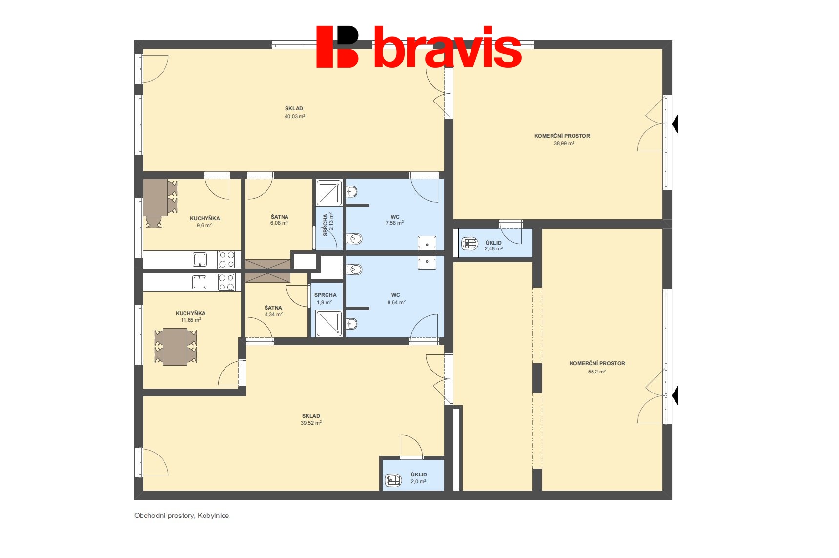 Ve výhradním zastoupení majitele nabízíme k pronájmu komplex obchodních a provozních prostor o celkové výměře 230 m² v obci Kobylnice, na ulici U Řempa. Prostory se nachází v přízemí budovy, disponují samostatnými vstupy z ulice a výlohami, což zajišťuje výbornou viditelnost a atraktivitu pro zákazníky. Celý objekt nabízí možnost pronájmu jako celek i po jednotlivých jednotkách, dle potřeb nájemce. Vhodné pro obchod, služby, showroom, kanceláře, zdravotnické či kosmetické služby, e-shop se zázemím, výdejní místo nebo kombinovaný provoz. Dispozice a využití: Prostor je rozdělen na několik funkčních částí: - 2× hlavní komerční prostor (cca 39 m² a 55 m²) - 2× sklad (cca 40 m² a 39,5 m²) - 2× kuchyňka - 2× šatna - 2× WC - 2× sprcha - 2× úklidová místnost Díky tomuto řešení je objekt ideální například pro: - více provozoven pod jednou střechou - větší firmu s oddělenými odděleními - zdravotnické, beauty či wellness centrum - kombinaci prodejny, skladu a administrativy Vytápění a ohřev teplé užitkové vody je zajištěn ze společné kotelny v domě. K prostoru náleží 2 vyhrazené parkovací místa. V rámci areálu je k dispozici cca 15 parkovacích míst pro nájemníky, která mohou využívat i tyto komerční jednotky. Další parkování je možné v rámci zásobovací komunikace za domem. Hlavní výhody: - výlohy a vstupy přímo z ulice - možnost rozdělení na více jednotek - velké skladové prostory - kompletní sociální a provozní zázemí - flexibilní využití - parkování v okolí - velmi dobrý technický stav Nemovitost se nachází v obci Kobylnice, v těsné blízkosti města Brna, s výbornou dostupností autem i veřejnou dopravou. Lokalita kombinuje klidné rezidenční prostředí s aktivní podnikatelskou zónou. V okolí se nachází bytová zástavba, firmy i služby, což zajišťuje stabilní pohyb potenciálních zákazníků. Výhodou je rychlé napojení na hlavní dopravní tahy směrem na Brno, Šlapanice, Slavkov u Brna a okolní obce. Lokalita je vhodná jak pro lokální podnikání, tak pro regionální působnost.