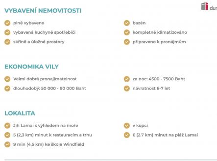 Prodej luxusních apartmánu 1+kk s výhledem na moře, bazénem a soukromou terasou, kompletně vybavený, za 2,3 mil Kč. Zažijte dechberoucí krásu ostrova Koh Samui v tomto luxusním apartmánu 1+kk s panoramatickým výhledem na thajský záliv v nově postaveném komplexu na kopci poblíž pláže Lamai. Apartmán s výhledem na moře nabízí klidnou a relaxační atmosféru díky svému výhledu na moře. Rezort je profesionálně spravován a je tak zaručena nejen bezchybná údržba apartmánu, ale také přísun rezervací. Apartmán je plně zařízený a vybavený kompletní kuchyní a je okamžitě k dispozici k nastěhování. Vyjděte na soukromou terasu a vychutnejte si osvěžující koupel v bazénu s výhledem na nádherné moře. Apartmán je pro větší bezpečnost vybaven také CCTV. Vlastnictví formou freehold umožňuje nákup apartmánu na Thajskou firmu, která je již pro tento účel zajištěna, Výhodná poloha apartmánu z něj činí ideální volbu pro ty, kteří hledají pohodlný a komfortní život, jen kousek od pláže, restaurací a místních služeb. 5 minut na pláž Lamai. 5 minut k restauracím a trhu. 15 minut na pláž Chaweng a nákupní centrum. 20 minut na mezinárodní letiště Ev. číslo: 651702.