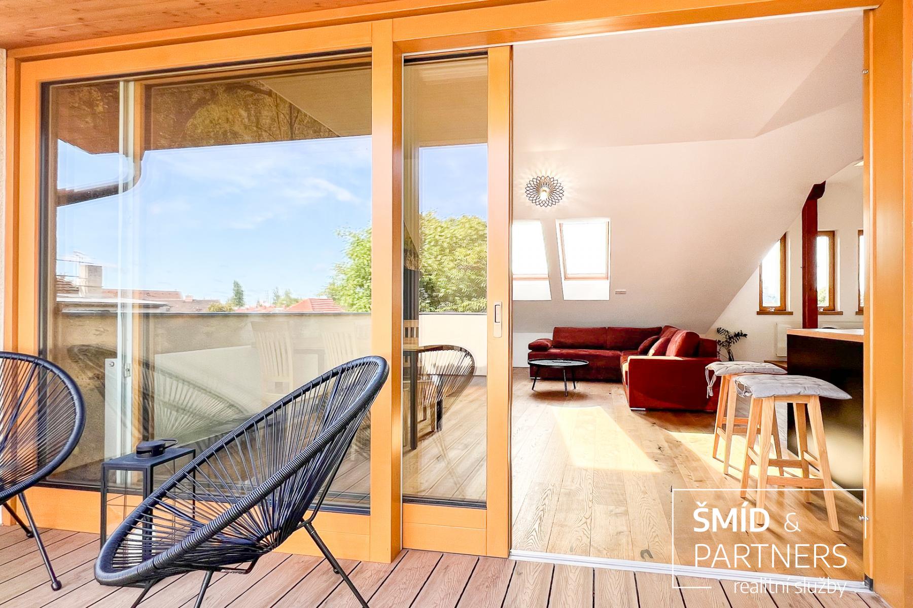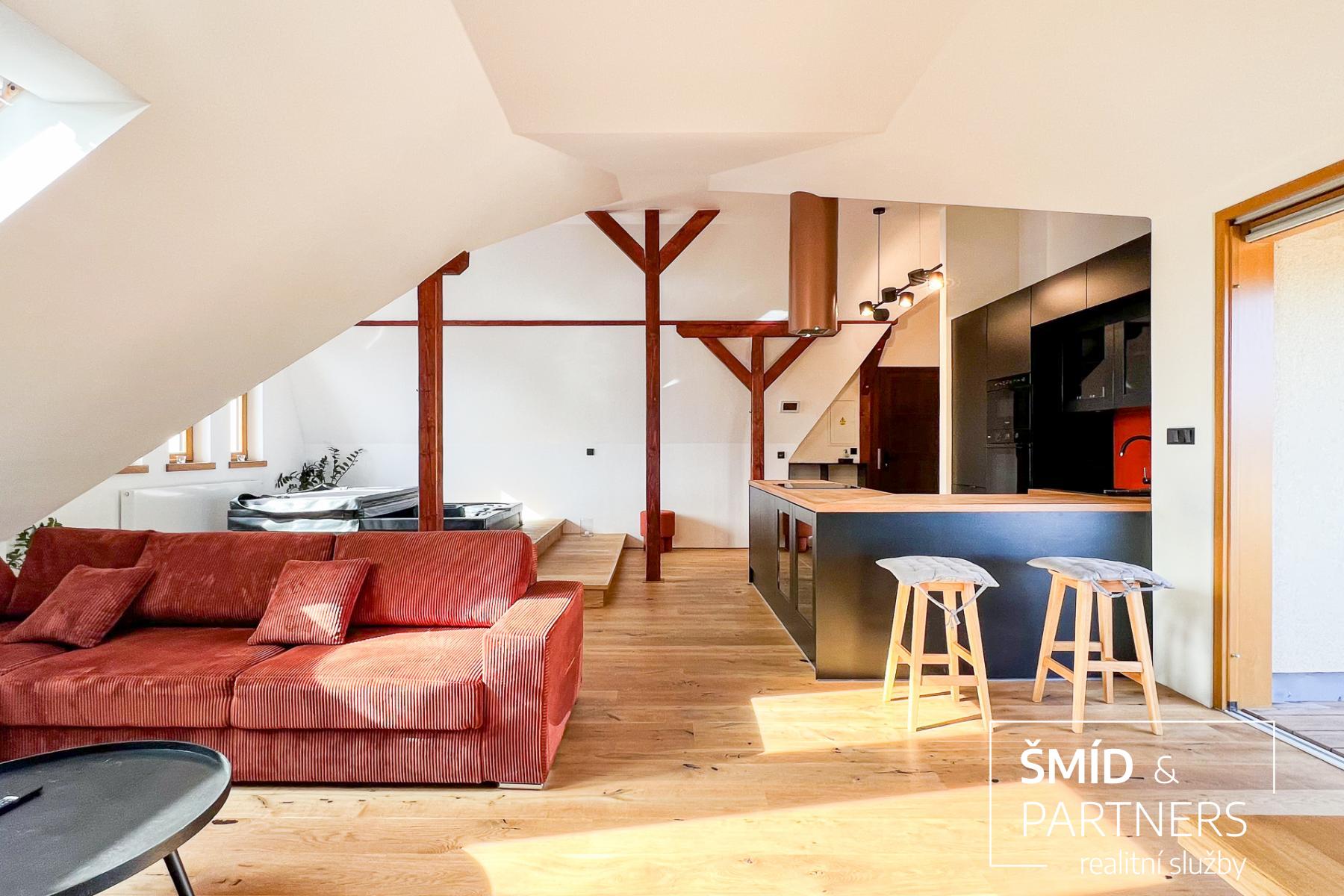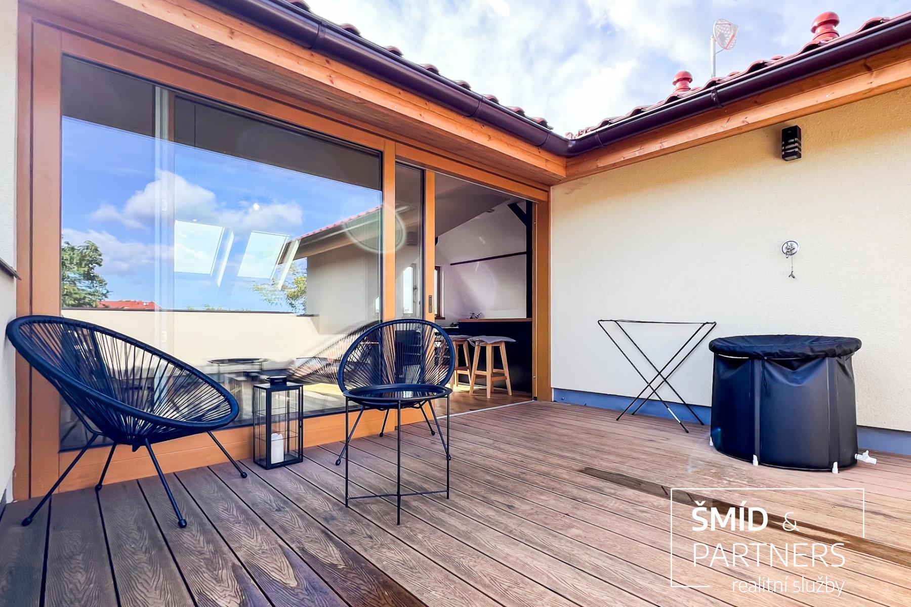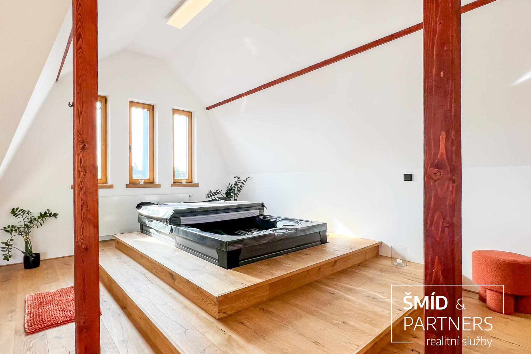 Nadstandardní byt o velikosti 82 m2 v podkroví s terasou, vířivkou, zahradou a saunou
