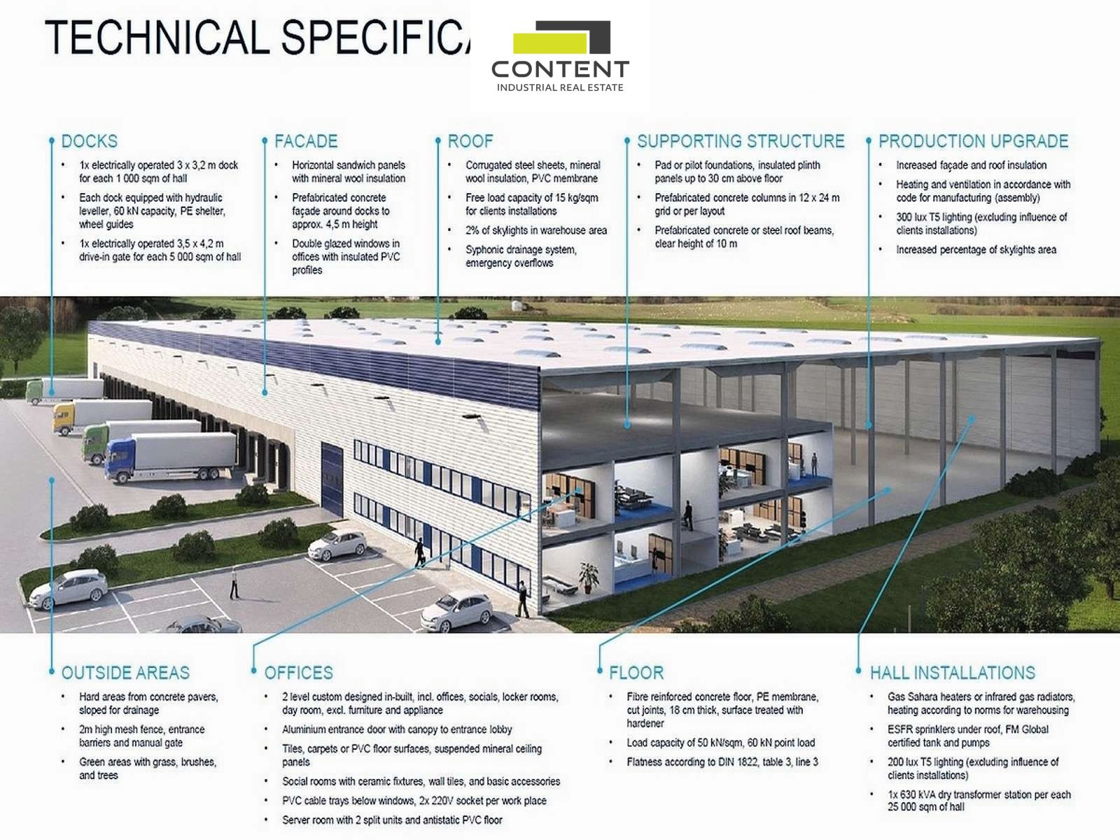 Pronájem skladu, výrobních prostor 11700 m² Stříbro. V zastoupení majitele a bez provize nabízíme pronájem skladu nebo výrobních prostor 11700 m², umístěných v novém komerčním parku přímo u dálnice D5, Exit 107. -ihned k dispozici samostatné budovy 11700 m² a 18000 m² - samostatné jednotky od cca 3000 m² - 18000 m², - drive-in, hydraulické rampy, osobní vstupy, - bezprašná podlaha s nosností minimálně 5 t/m², - příjezd a parkování TIR bezproblémové, - zastávka autobusu u areálu, - kanceláře, showroom a sociální zázemí na klíč, - možnost přizpůsobení prostordle potřeby a charakteru budoucího provozu - v areálu možnost výstavby budovy na míru, dle požadavku až 33.800 m² . Cena bude stanovena dle pronajatých m² a dalších podmínek smlouvy. Fotografie hotových budov jsou pouze ilustrační, z již proběhlé výstavby. Pro více informací nás kontaktujte.