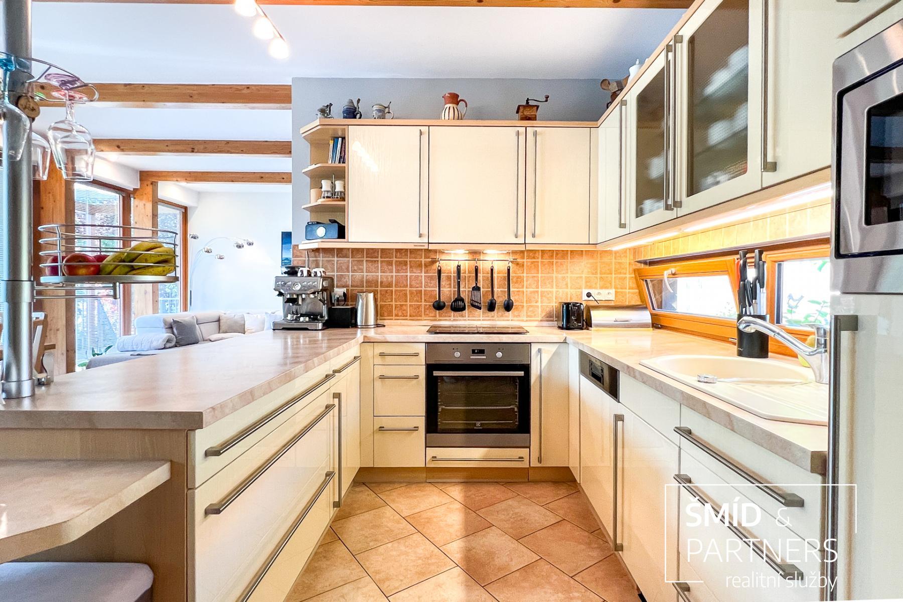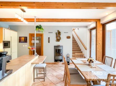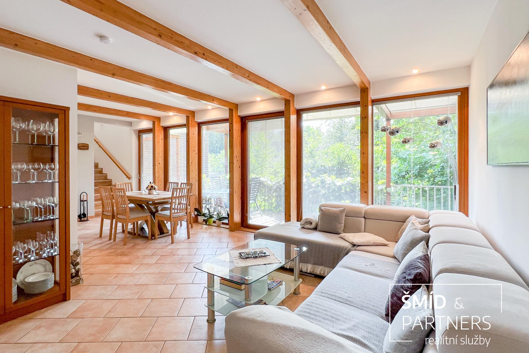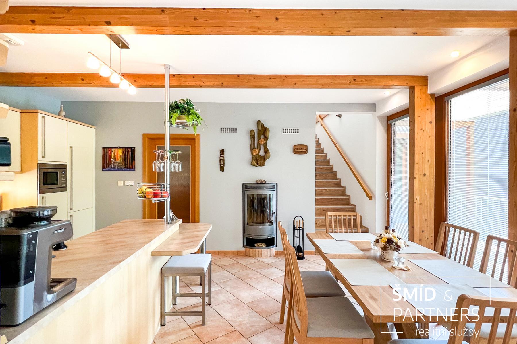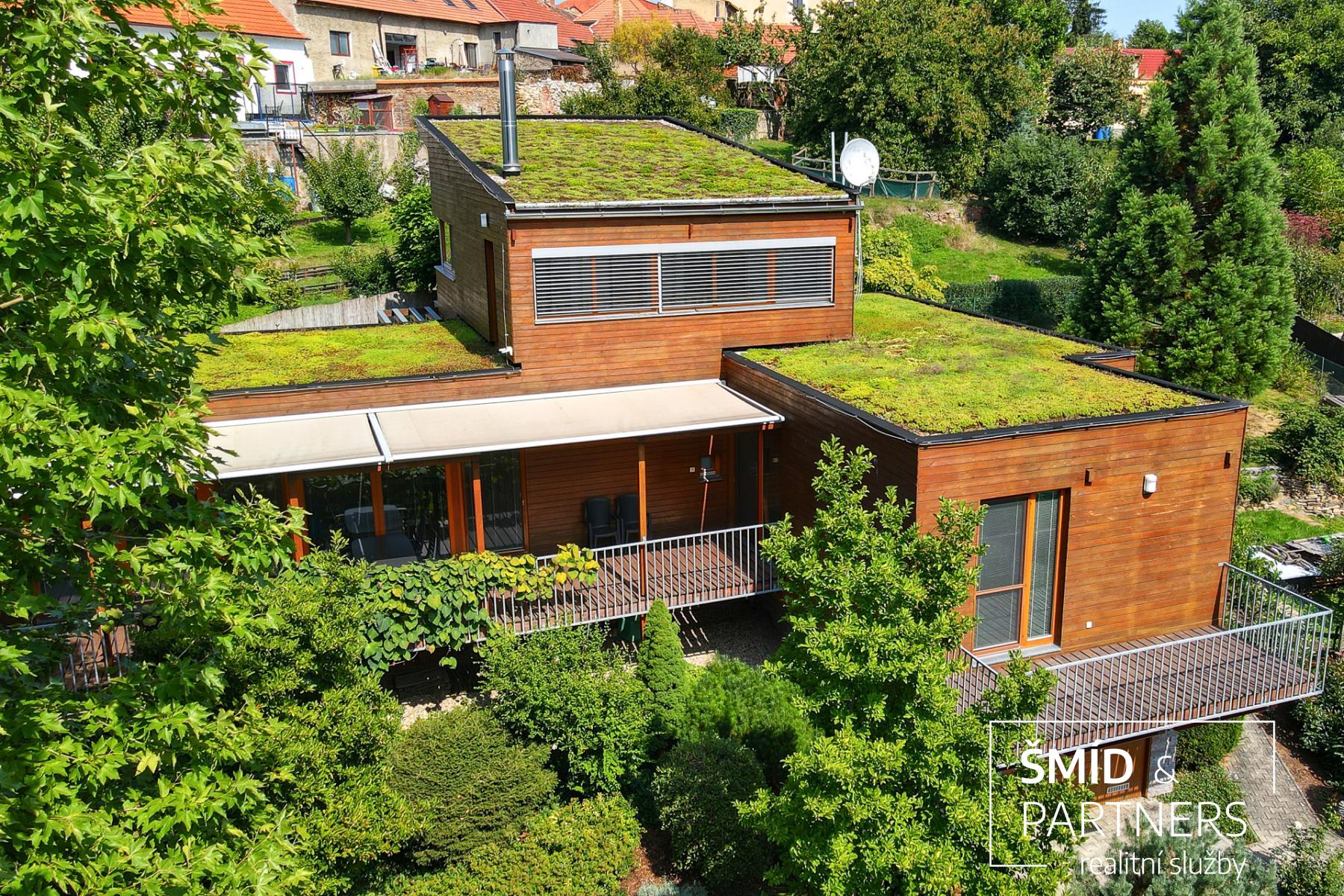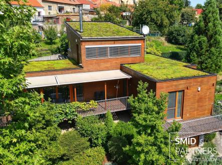 Nabízíme Vám k prodeji mimořádnou nemovitost - prostorný rodinný dům 6+2 na pozemku o rozloze 1759 m2, nacházející se v atraktivní lokalitě historického města Kouřim. Projektantem je Ing. arch. Josef Smola, který je známý realizacemi především pasivních a nízkoenergetických staveb. Dům byl kolaudován v roce 2005 a je ve velmi dobrém stavu. Byl postaven ze dřevěných panelů, zateplen polystyrenem, a navíc obložen dřevem. Celková tloušťka stěn je 38 cm. Základy jsou betonové. Plocha zelené střechy, která je výborným izolantem, je 215 m2 na domě a dalších 55 m2 na parkovacím stání. Celková užitná podlahová plocha prvního a druhého nadzemního podlaží je 245 m2. Plocha suterénních a skladovacích prostor pod domem je 130 m2. Součástí domu jsou 3 terasy, celkem 53 m2. Na pozemku jsou parkovací stání pro 3 auta. Vytápění je elektrické a je rozvedeno po většině domu podlahami. V ostatních místnostech jsou přímotopy. Alternativou jsou krbová kamna na tuhá paliva v obývacím pokoji. Kanalizace i vodovod jsou obecní. Dům má dvě oddělené bytové jednotky a je vhodný především k bydlení pro vícečlennou rodinu. Každá bytová jednotka má vlastní vchod, vlastní terasu, koupelnu a kuchyň a také vlastní parkovací stání. Dále je k dispozici sauna, relaxační místnost a další technické místnosti a šatny. Po domě je rozvedeno centrální vysávání. Je tu instalován systém na dodatečnou filtraci pitné vody. Dům využívá speciální systém přisávání a odsávání vzduchu, který funguje zcela automaticky a odsává teplý a vlhký vzduch z koupelen a kuchyní. Nemovitost je napojena na pult centrální ochrany, má všude pohybová bezpečnostní čidla. Na okrasné zahradě je instalován závlahový systém. Na oknech v prvním patře jsou elektrické rolety a na terase elektrická markýza. Co se týče PENB, je patrné, že tabulka Ukazatele energetické náročnosti sice uvádí ve dvou kategoriích třídu B (velmi úsporná) a ve třech kategoriích třídu C (úsporná), ale celkově vychází na G. Zařazení do třídy G vychází výhradně z dikce uvedené vyhlášky, která znevýhodňuje energie z neobnovitelných zdrojů koeficientem 2,6 ve srovnání s energiemi ze zdrojů obnovitelných. Jedná se tedy ryze o klimatický pohled současné doby bez vazby na skutečný stav a technické řešení a elektrické vytápění bez využití fotovoltaiky nebo tepelného čerpadla zařadí jako klimaticky nevhodné, a tudíž třída G.. Z praktického pohledu běžného života v RD a porovnání obytné plochy s roční skutečně spotřebovanou elektrickou energií (vytápění, ohřev vody, osvětlení, vaření, ostatní elektrospotřebiče v domácnosti a sauna) vychází energetická náročnost na hodnotu ca 95 kWh/ m2. . Celková spotřeba elektřiny v celém RD (oba byty + technické zázemí vč. sauny) za sezónu 23/24: 19,138 MWh ( 17.427 MWh nízký tarif ) , 0,075 -přepočet na MWh/1 m2, Celkově 116 362,- za rok. Dále vodné a stočné cca 1 580,-/měsíc včetně závlahy zahrady, pult centrální ochrany 1 000,-/ měsíc
