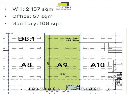 Pronájem skladu, výrobních prostor Kozomín. V zastoupení majitele a bez provize nabízíme industriální prostory pro sklad nebo výrobu, v blízkosti dálnice D8 Exit 9 Úžice. Novostavba samostatné industriální budovy: - k dispozici ihned 2157 m² - vestavěné kanceláře 57 m² + zázemí 108 m², další dle požadavku - denní světlo dle norem, LED osvětlení - bezprašné, vysoko-zátěžové podlahy s minimální nosností 5 t/m² - vytápění plynem - kryté rampy (3x) i vjezd v úrovni vozovky - světlá výška prostor 10,6 m - rastr sloupů 33,6 m x 9/12 m - příjezd a parkování osobní i nákladní dopravy bezproblémové - výborná lokalita blízko Prahy u D8 - v areálu ihned k dispozici 1000 m² až 20000 m² Cena nájmu bude stanovena dle dalších podmínek smlouvy. Pro více informací nás kontaktujte.