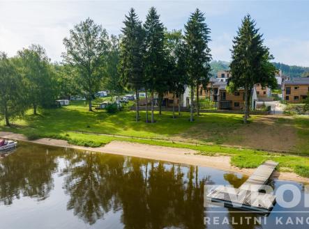 Prodej luxusní chaty k nastěhování v uzavřeném areálu s bazénem přímo u pláže Slapské přehrady