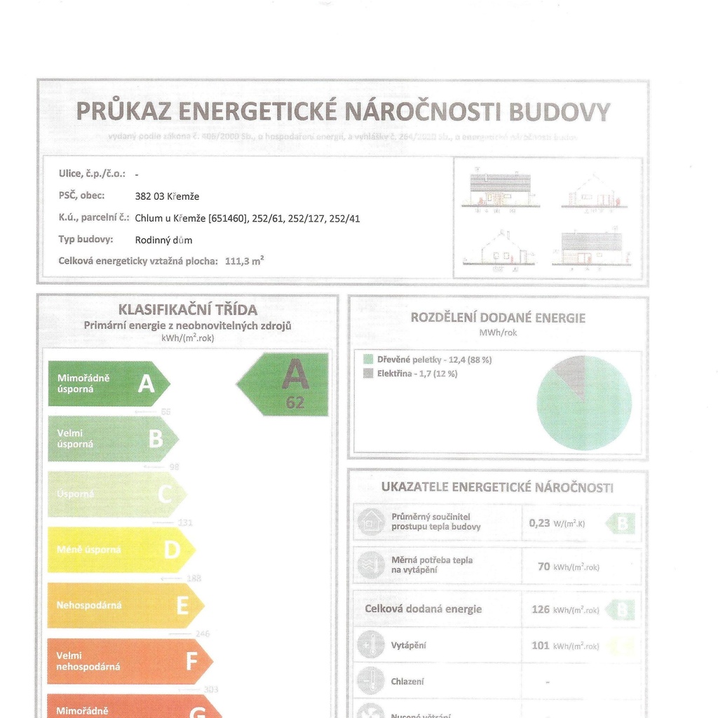 Předmětem prodeje je stavba moderního RD v Chlumu u Křemže, malebné obci pod Kletí. Nemovitost o 117 m2 se nachází na pozemku o výměře 958 m2 a její součástí je zděná stavba o 35 m2, využitelná po menší rekonstrukci jako samostatný obytný domek např. k budoucímu pronájmu. V domě je plánovaný prostorný obývací pokoj spojený s kuchyní. Praktické rozložení místností zahrnuje také samostatnou ložnici, dva další pokoje a dvě toalety (1x s koupelnou) a technickou místnost. Dům je napojen na inženýrské sítě kromě plynu. Vytápění je řešeno přes teplovodní podlahové topení napojené na tepelné čerpadlo. V obývacím pokoji krbová kamna. En. náročnost budovy: A mimořádně úsporná. Na pozemku se nachází také kopaná studna s užitkovou vodou. K úplnému dokončení domu zbývají následující dostavby: Vnitřní dveře Stropy, půdní schody Podlahy (vinyl, stěrka) Obložení koupelny, toalety, TM + sanita, vnitřní parapety Izolace stropu Zámková dlažba a stání: Elektrika, kompletace ZTI, kompletace Tepelné čerpadlo Panasonic split (vzduch/voda ) o nominálním výkonu 7 kW s frekvenčním řízením výkonu kompresoru a dálkového ovládání SMART CLOUD je již nainstalováno a je započteno v celkové ceně. Dům je v současné době nepřetržitě temperován. Kompletní dostavbu domu je možné realizovat firmou, která dosud stavbu prováděla s tím, že dokončovací práce budou dle požadavků budoucího majitele. Majitel stavby rád pomůže i s vyřízením kolaudace na Stavebním úřadě v Křemži. Veškerá občanská vybavenost v obci Křemže – školka, škola, zdrav. zařízení, obchody, pošta a další. Majitel je ochotem o konečné ceně jedenat v případě faktického zájmu. Pro více informací popř. prohlídku nemovitosti kontaktujte makléře této zajímavé nabídky.