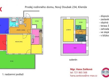 Nabízíme samostatně stojící rodinný dům o dispozici 3+1 s terasou a zahradou pod nejvyšší horou Blanského lesa Kletí (1084 m n.m.) . Nemovitost se nachází ve vyhledávané lokalitě v dojezdové vzdálenosti 20 min od Českých Budějovic a 19 min od Českého Krumlova. Na pozemku s celkovou výměrou 891 m2 je situována částečně podsklepená stavba rodinného domu se zastavěnou plochou 108 m2 (včetně terasy 26 m2). Dále je na pozemku domek na zahradní nářadí. V suterénu (1.PP) se nachází prádelna (9 m2), sklad (7 m2), kotelna (4 m2), spíž (1 m2), chodba se schody (7 m2). Do domu se vchází po schodech ze severu. V prvním nadzemním podlaží se nachází vstupní chodba (10 m2) se vstupy do většiny částí domu: na WC (1 m2), ke vstupu do suterénu, do kuchyně (7 m2), do koupelny (3 m2), do pokoje (13 m2) a do obývacího pokoje s jídelnou (25 m2). Obývací pokoj a ložnice (12 m2) jsou orientovány na jih a mají výhled na terasu. Z obývacího pokoje je přímý vstup na velkou jižní terasu (26 m2), ze které je krásný výhled do okolí. V suterénu se nachází kotelna s plynovým kotlem (+ kotel na tuhá paliva, elektrický bojler 50 l) a prostorné suché a čisté sklepní prostory (sklad, prádelna,...). Na zděném 1.PP je postavena montovaná stavba z roku 1972 (Rodinný domek Multi 066- Východočeské dřevařské závody Trutnov), je koncipována jako smíšená (panely jsou opatřeny z obou stran lignátovými deskami, příčky jsou z dřevotřísky, pokryty sololitem). Objekt je napojen na veřejný rozvod elektřiny (400/230 V), plynu, vody a kanalizace. Přístup je z asfaltové obecní komunikace, která je slepá (velmi klidná lokalita). Dům je možno vytápět plynovým kotlem či kotlem na tuhá paliva. Telefonní přípojka dovedena na okraj pozemku v případě možného připojení k internetu. Na pozemku jsou již vzrostlé okrasné dřeviny a ovocné stromy. Též vyvýšené záhony na možné pěstování zeleniny. Nemovitost doporučuji zájemcům hledajícím bydlení v rodinném domě se zahradou či jako chatu, v klidné lokalitě v blízkosti přírody, přitom v místě s plnou občanskou vybaveností (obecní úřad, škola, školka, obchody, lékaři, dům s pečovatelskou službou, pošta, knihovna...) a dobrou dopravní dostupností, vzdáleném 17 km od Českých Budějovic a 15 km do Českého Krumlova. Více informací u makléře nabídky. V případě více zájemců bude upřednostněna vyšší nabídka.