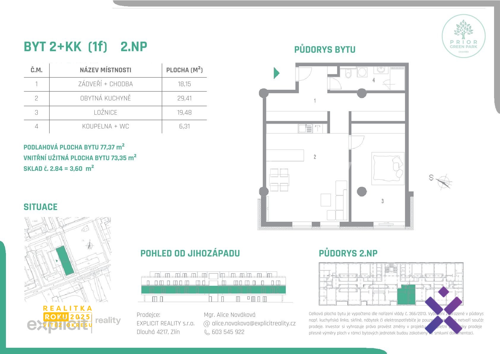PRIOR KROMĚŘÍŽ – moderní bydlení v srdci historického města Mgr. Alice Nováková & Explicit Reality nabízí možnost výběru z 37 bytových jednotek o dispozicích 1+kk, 2+kk a 3+kk v novém polyfunkčním domě PRIOR KROMĚŘÍŽ, který vzniká citlivou rekonstrukcí ikonické budovy na Slovanském náměstí. Projekt spojuje výbornou městskou adresu s klidným bydlením. Část bytů je orientována do přilehlého parku, což zajišťuje příjemný výhled i dostatek soukromí. Byty budou předávány ve vysokém standardu zahrnujícím dokončené omítky, podlahy, interiérové dveře a kompletně připravené koupelny včetně sociálního vybavení. Klienti si mohou vybrat z až čtyř designových standardů obkladů a dlažeb, díky čemuž si snadno přizpůsobí interiér svému vkusu. V přízemí budovy budou umístěny obchody a služby, což přispívá k pohodlí budoucích obyvatel. Samozřejmostí je výtah, sklepní kóje a možnost odkupu vlastních parkovacích stání. Lokalita nabízí kompletní občanskou vybavenost: obchody, školy, lékařské služby i zastávky MHD jsou v bezprostřední blízkosti. Díky své poloze, promyšlenému konceptu a variabilitě bytů je PRIOR KROMĚŘÍŽ ideální jak pro vlastní bydlení, tak jako investice k pronájmu. U vybraných jednotek je možný odpočet DPH. Pro více informací o dostupných bytech, cenách a standardech nás neváhejte kontaktovat. Rádi Vám zprostředkujeme osobní prezentaci projektu a pomůžeme Vám vybrat ideální byt na míru.