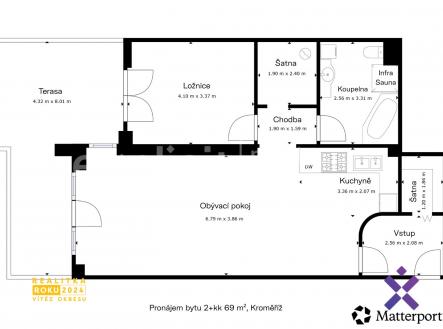 Pronájem prostorného 2+kk s terasou, infrasaunou a možností garáže – Kroměříž, Nitranská Hledáte moderní a pohodlné bydlení s dostatkem prostoru a soukromí? Tento slunný byt 2+kk o rozloze 69 m² v přízemí domu na okraji Kroměříže vás nadchne velkou terasou 20 m², výhledem do zeleně a jihozápadní orientací, díky které je v bytě dostatek světla po celý den. Hlavní přednosti bytu: - prostorná terasa s možností grilování - infrasauna přímo v koupelně - dvě šatny (v ložnici a v zádveří) - podlahové vytápění - možnost pronájmu až dvou garáží (každá 3 000 Kč/měs.) - klidná lokalita s výhledem do zeleně Dispozice a vybavení: - obývací pokoj s koženou sedací soupravou, TV a konferenčním stolkem - komfortní kuchyňská linka – myčka, lednice s mrazákem, varná deska, trouba - jídelní stůl se židlemi - ložnice s prostornou šatnou - koupelna s infrasaunou - kolárna v domě, 3 místa k dispozici Náklady: - nájemné: 18 500 Kč/měs. - služby: 1 192 Kč/měs. - elektřina: přepis na nájemníka (doporučeno 3 500 Kč/měs.) - vratná kauce 21 000 Kč + provize RK 21 000 Kč - internet si nájemník sjednává individuálně Lokalita: Byt se nachází na adrese Nitranská 4487, Kroměříž, v klidné části města s výbornou dostupností do centra i do přírody. Ideální volba pro ty, kdo chtějí kombinaci komfortního bydlení a soukromí. Podmínky pronájmu: Preferujeme spolehlivé a platící nájemníky, dlouhodobý pronájem vítán. Zaujala vás tato nabídka? Domluvte si prohlídku ještě dnes a přijďte se přesvědčit osobně, jak příjemně se vám zde může bydlet..