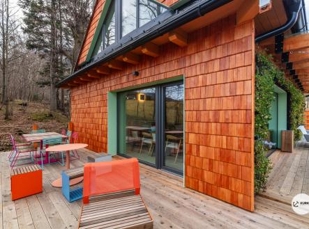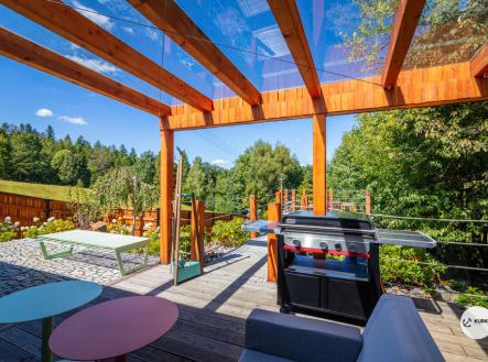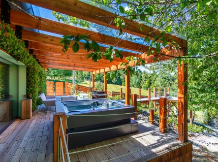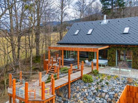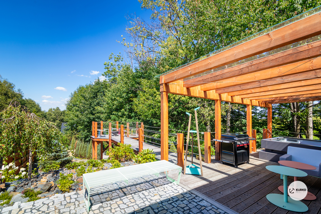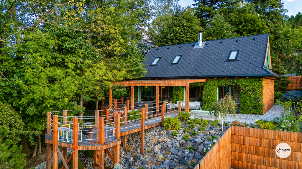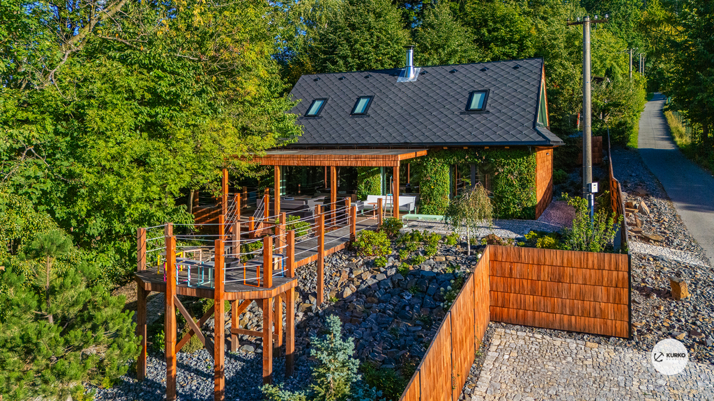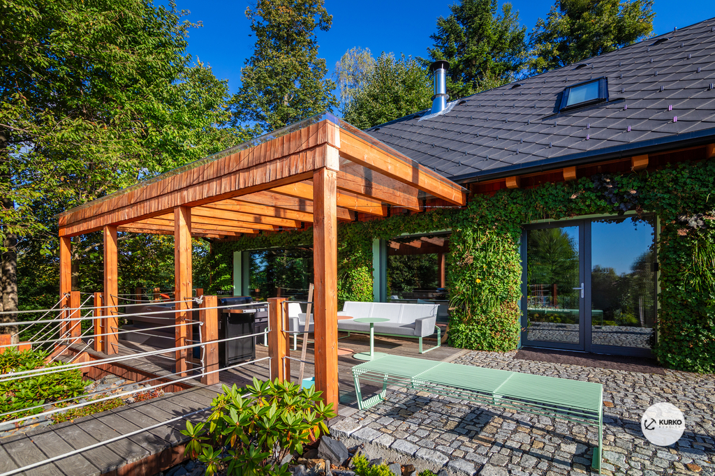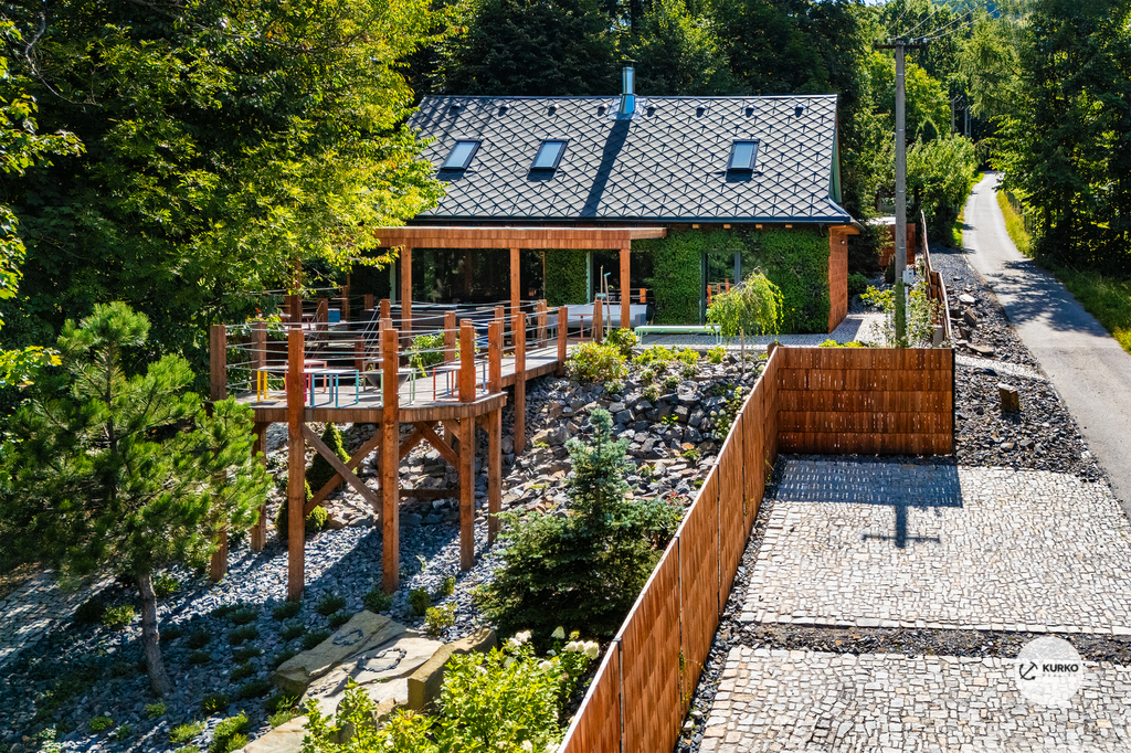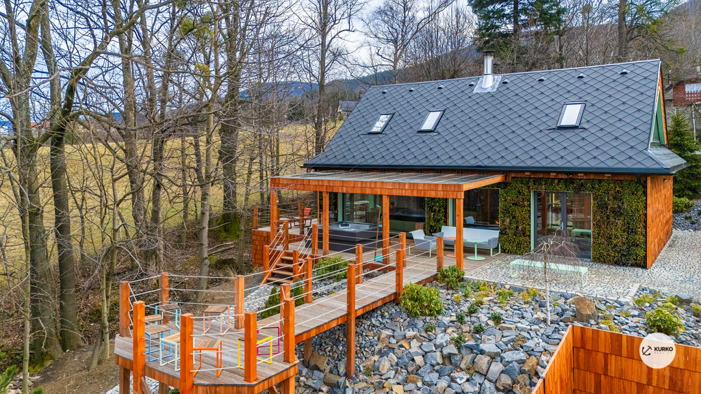 Nabízíme novostavbu rodinného domu o dispozici 4+KK stojící na pozemku o výměře 1.321 m2 v obci Kunčice pod Ondřejníkem. Velkoryse postavený a vybavený, zděný objekt se nachází v klidné části obce s příjezdem po obecní asfaltové komunikaci. Dům je plně dokončen a připraven k okamžitému užívání. Pokud hledáte nadstandardní nemovitost, která se k prodeji v Beskydech nevyskytuje, rádi Vás přivítáme na prohlídce. Majitel kladl důraz na maximální kvalitu použitých stavebních a interiérových prvků, kdy byla v exteriéru instalována automaticky zavlažována fasáda z živých rostlin, dřevěných došek, terasa o rozměru 105 m2, kde je dominantou vířivka Španělského výrobce vč. skleněného zastřešení k maximálnímu požitku. Tato terasa disponuje množstvím nábytku vyrobeného na míru, grilu zn. Weber a vyhlídky s posezením u ohniště. Pozemek je upraven zahradníkem s množstvím stromů, keřů a rostlin. O travnatou plochu se stará automatická sekačka zn. Husqvarna. K uskladnění dřeva je k dispozici prostorný dřevník. Na pozemku je již příprava prostoru k instalaci sauny. Pozemkem protéká místní potůček, který vytváří příjemnou a uklidňující atmosféru. Nemovitost se nenachází v záplavovém území. V 1NP se nachází zádveří, obývací prostor s plně vybavenou kuchyní o celkové výměře přes 60 m2, koupelna s dvěma kamennými umyvadly a velkým sprchovým koutem, samostatné wc a dvě technické místnosti. Z obývacího pokoje je přímý vstup na terasu. Hlavní dominantou obývacího prostoru je oboustranně prosklený krb zn. Höxter s šířkou 110 cm. V celém 1NP jsou na podlaze, stěnách, dveřích použity nejmodernější cementové stěrky a na stropě instalovány dřevěné došky, které doplňují vzhled exteriéru. V 2NP se nachází tři neprůchozí ložnice, koupelna s menším sprchovým koutem. V hlavní ložnici je umístěna volně stojící vana s krásným výhledem do přírody. Ve všech ložnicích je k dispozici stínící technika. Dům je napojen na elektřinu 230/400V, voda je z nově vybudovaného hlubinného vrtu, odpad je řešen čov. Vytápění zajišťuje tepelné čerpadlo zn. Daikin s rozvodem do všech podlahovým ploch. V případě, že hledáte plně vybavenou nemovitost bez kompromisů v chráněné krajinné oblasti Beskyd s možností odpočtu DPH, tak neváhejte kontaktovat makléře pro domluvení schůzky.