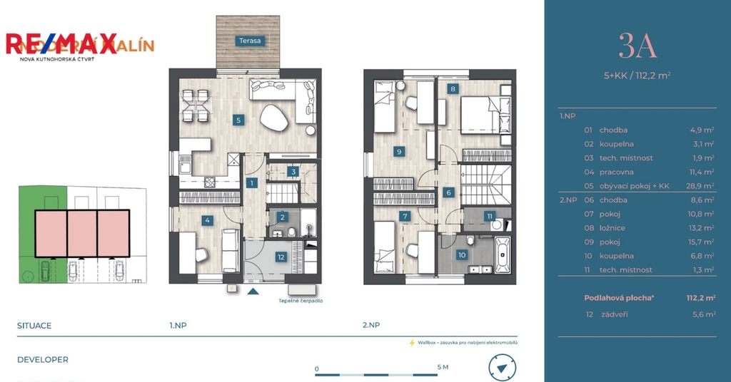 Dovolujeme si Vám představit prodejní nabídku rodinného domu o dispozici 5+KK, terasa + 2x parking, připraveného k okamžitému nastěhování, v nově vybudované čtvrti Moderní Malín v Kutné Hoře. Vybírat zde můžete z několika dokončených domů a vybrat tak ten, který bude nejvíce vyhovovat Vašim představám o dokonalém bydlení. Každý dům nabízí do detailu promyšlenou dispozici 5+kk - 4 samostatné pokoje, obývací pokoj s kuchyňským koutem, 2 koupelny a technickou místnost. Venku posedíte na terase či na zahradě a před domem zaparkujete dva své vozy. Jedna Vaše návštěva a prohlídka domu však vydá za stovky slov, proto nám zavolejte a domluvte si prohlídku ještě dnes. Pár důvodů, proč si vybrat tento dům jako Váš budoucí domov: Vysoký standard, domy jsou hotové, promyšlené a připravené k okamžitému nastěhování. Úsporné technologie a udržitelné bydlení – moderní konstrukce, smysluplné technologie, které šetří peněženku i planetu. Lokalita na jedničku – do centra Kutné Hory to máte doslova na pár kroků; skvělá dostupnost, MHD, vlak, i silnice 39. Klidná čtvrť s perspektivou – projekt připravuje celou občanskou vybavenost: školku, lékařský dům, obchody, sportoviště, biotop s jezírkem. Investiční potenciál – nové bydlení v rostoucí lokalitě znamená, že hodnota poroste spolu s místem. Každý dům zahrnuje zahradu či terasu a parkovací stání pro dva vozy. Lokalita nabízí klidné prostředí s přírodou doslova za domem a zároveň rychlý dosah do města. Standard domu je moderní, promyšlený a připravený sloužit dlouhé roky. Domy vznikly pod taktovkou developerské společnosti Marlo, která díky svým dlouholetým zkušenostem zaručuje vysoký standard zpracování. Domy se nacházejí v ulici Radimova, v klidné části města s komfortním spojením do Prahy do 50 minut. Celý projekt spojuje moderní architekturu, úsporné technologie a komfort přírody i města v jednom. Veškeré bližší informace a technické podklady Vám rádi zašleme nebo ještě lépe - ukážeme při osobním setkání. Nový domov totiž nevyčtete, ale vycítíte, tak přijďte a přesvědčte se!