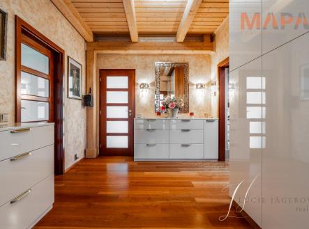Tento výjimečný rodinný dům není jen stavba, ale skutečný domov, který od prvního návrhu vznikal s láskou, srdcem a duší. Majitelé od začátku kladli důraz na kvalitu, nadčasovost a příjemnou atmosféru, nikoli na pomíjivou modernu. V každém detailu je cítit poctivé řemeslo a teplo domova. Obytná plocha domu činí 258,83 m, celková plocha pozemku je 1 187 m, zastavěná plocha 165 m a plocha zahrady 1 022 m. Dům má dispozici 7+kk, tři koupelny, sklep o velikosti 150 m (téměř celý dům podsklepen) a přípravu na zimní zahradu. Dům se nachází v klidné obci Libeř, pouhých 15 minut od jižní hranice Prahy (Modřany/Písnice) a zhruba 30 minut od centra. Jen 3 km je to na dálnici a 10 minut k budoucí stanici metra Písnice, jejíž otevření je plánováno na rok 2029. Za domem se rozprostírá les bez stavebních pozemků, kde se nikdy stavět nebude, a výhled i klid tak zůstane zachován. K plotu pravidelně přicházejí srnky, které se staly milými sousedy. Na zahradě se nachází přírodní koupací jezírko, ideální pro letní osvěžení i relaxaci. Atmosféru dotvářejí velké kameny pocházející z historického Cholupického tunelu, které majitelé pečlivě rozmístili jako dekorativní prvek. Tento unikátní materiál dodává zahradě osobitý charakter a propojuje ji s přírodou i místní historií. Dům je navržen tak, aby mohl sloužit i jako dvougenerační bydlení. Sklep o ploše 150 m nabízí široké možnosti využití. Dům je napojen na veřejný vodovod VDS Benešov a zároveň disponuje vlastní studnou s kojeneckou vodou, napojenou přímo do domu. Voda má certifikovanou kvalitu pro pití a je ideální i pro malé děti. Interiér domu je vybaven třemi koupelnami se sanitou a obklady značky Villeroy and Boch (v dětské koupelně vana Ravak). Podlahy jsou v horním patře anhydritové, v přízemí betonové, s kombinací dřeva a korku pro teplý a měkký došlap. Kuchyňská linka Hanák je doplněna přírodní kamennou deskou z labradoritu. Samozřejmostí je vestavná myčka, trouba, mikrovlnná trouba a spíž. O komfortní klima se stará rekuperační systém a vytápění značky Acrea s distribucí tepla po celém domě. K dispozici je i krb pro příjemnou atmosféru a přitápění, podlahové topení po celém domě (aktuálně nevyužíváno), elektrické otopné žebříky, centrální vysavač a elektrický bojler o objemu 900 l rozdělený na tři patrony, takže nikdy nedojde teplá voda. Okna jsou osazena trojskly (část značky Velux), dveře jsou bezpečnostní s nerozbitnými skly, střecha je z pálené lesklé glazované krytiny Tondach 12 a komín je systém Schiedel. Připravená je i možnost realizace sauny, carportu a zimní zahrady. Z každého pokoje v horním patře je vstup na balkon s výhledem do zahrady a okolní přírody a samozřejmostí jsou elektrická pojízdná vrata pro vjezd aut. Obvodové zdi domu jsou vyrobeny z masivního severského smrku pocházejícího z oblasti za polárním kruhem. Tento materiál je až třikrát dražší než běžný stavební smrk, protože roste velmi pomalu, má husté letokruhy a patří mezi nejlepší přírodní tepelné izolanty. Je vysušený, stabilní, odolný proti praskání a sesychání a zajišťuje příjemné mikroklima s optimální vlhkostí po celý rok. Na rozdíl od běžných dřevostaveb nejde o sendvičovou konstrukci nosné i izolační vlastnosti zajišťuje jediný masivní materiál, což znamená dlouhou životnost a minimální údržbu. Vnitřní příčky jsou v přízemí z Ytongu a v patře ze sádrokartonu s trojitým pláštěm pro odlehčení konstrukce. V obci Libeř a blízkém okolí je dobrá občanská vybavenost. Základní škola Libeň je vzdálena cca 3 km, ZŠ Amos v Psárech rovněž 3 km, mateřské školy jsou v Libni i Psárech. Obchody a služby nabízí přímo obec (například Libeřské lahůdky), kompletní občanskou vybavenost pak Dolní Břežany a Jesenice, vzdálené přibližně 5 km, kde najdete Albert, Lidl i Tesco. Elektřinu zajišťuje E.ON, kanalizace je obecní. Náklady na elektřinu činí přibližně 15 000 Kč měsíčně. Pokud hledáte kvalitní bydlení pro svou rodinu, které spojuje komfort, přírodu a soukromí, jste na správném místě. Zavolejte ještě dnes ráda vám tento jedinečný domov osobně představím. Z důvodu chybějícího PENB uvádím energetickou třídu G. Budu dokládat zpětně tři roky vyúčtování energií.