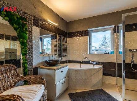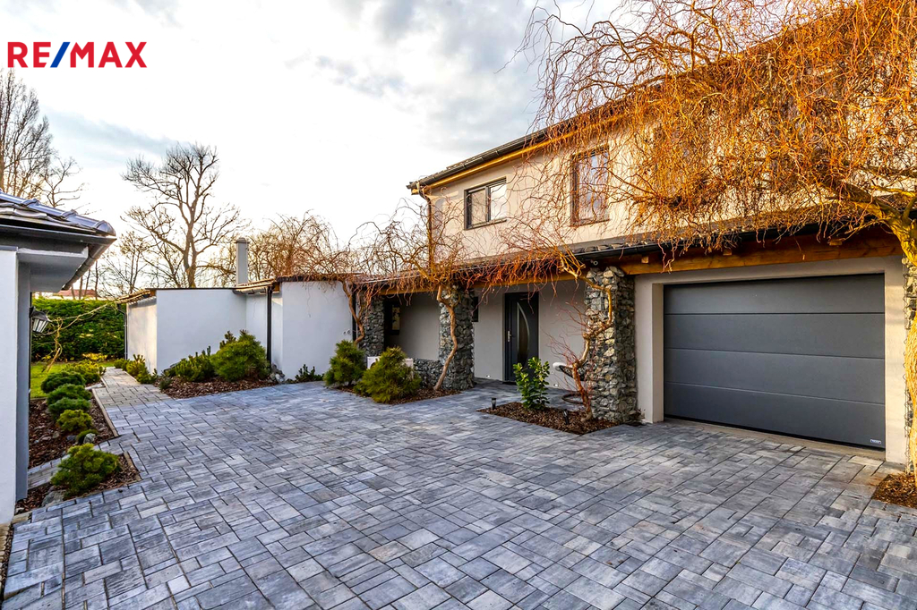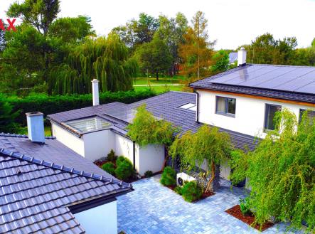 Prodej nadčasového domu s vlastním wellnessem, domem pro hosty a garáží v okrese Praha-Východ.