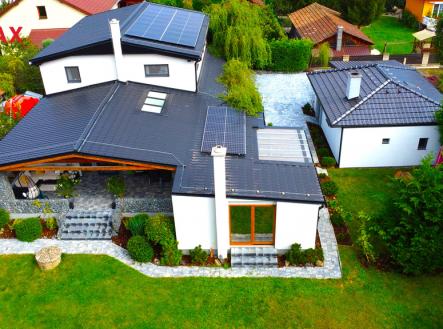 Ve výhradním zastoupení majitele si vám dovolujeme nabídnout exkluzivní nízkoenergetický náročný zateplený cihlový patrový rodinný dům kolaudovaný v roce 2018 o dispozici 6+KK vč. 21 solárních panelů, vlastní wellness částí, vyhřívanou garáží a domem pro hosty o dispozici 2+kk o celkové výměře 311 m² a zahradou o výměře 799 m² v obci Libiš, která je vzdálená 15 minut jízdy autem od hranice hlavního města Prahy. Díky energetické náročnosti A a 21 solárními panely, jsou poplatky za režii celého objektu mezi 5.000,-Kč!!!! kapacita baterií činí 21 kWh. Objekt je napojen na všechny inženýrské sítě vyjma plynu. Nechybí ani vlastní vrtaná studna, která je přivedena do domu. Ohřev vody zajišťuje 3x e. boiler, který je umístěný v každé budově. Vytápění v hlavní budově je řešeno podlahovým vytápěním v každém patře vč. garáže. Vše je pohaněno tepelným čerpadlem voda-vzduch. Další možností je využití krbových kamen na tuhá paliva. V domě pro hosty je vytápění řešeno primárně krbem. Další možností jsou případně elektrické přímotopy. Ve wellness části je vytápění řešeno krbem a podlahovým topením. Hlavní budova vám nabídne dvě patra o celkové ploše 228,38 m². 1. patro čítá plochu 155,6 m² kde vás uvítá reprezentativní vstupní hala. Po celé ploše spodního patra je položena italská dlažba 60x60 ve které je aplikováno podlahové topení. Z hlavního vstupu či vstupu z obývací prostoru vás uvítá rozlehlá terasa o výměře 42 m². V daném patře se nachází koupelna s rohovou vanou vč. toalety a toaletou pro hosty. 2. patro čítá plochu 72,78 m² nachází se zde 3 obývací místnosti + koupelna se sprchovým koutem a vanou. Po celé ploše horního patra je položena dřevěná laminátová podlaha. V případě zájmu máme vydané i stavební povolení v rámci nástavby/přístavby, kde v projektu byl zakomponován i výtah. Vytvořila by se prostorná obývací místnost o výměře 38,88 m² + velkorysá terasa s výměrou 51,51 m². Wellness část nabízí krásných 45 m². Nachází se zde bazén se slanou vodou (vyhřívaný) a na míru dělaná sauna. Nechybí ani otevřená sprcha a krbová kamna. Dům pro hosty o dispozici 2+KK s výměrou 38,4 m² V těsné blízkosti se nachází škola a školka. Hned za domem se nachází Špičáková zahrada. V obci se dále nachází pošta a obecní úřad. Kompletní občanská vybavenost je v obci Neratovice, která je vzdálená pouhých 5 minut autem. Velkou výhodou je perfektní autobusové spojení, díky kterému se dostanete do 25 min na metro Ládví. S financováním vám moc rádi pomůžeme. Pro více informací neváhejte kontaktovat makléře nabídky.