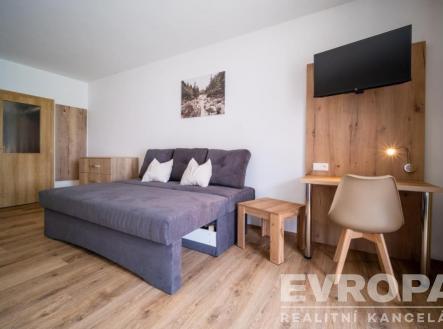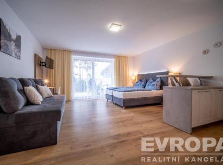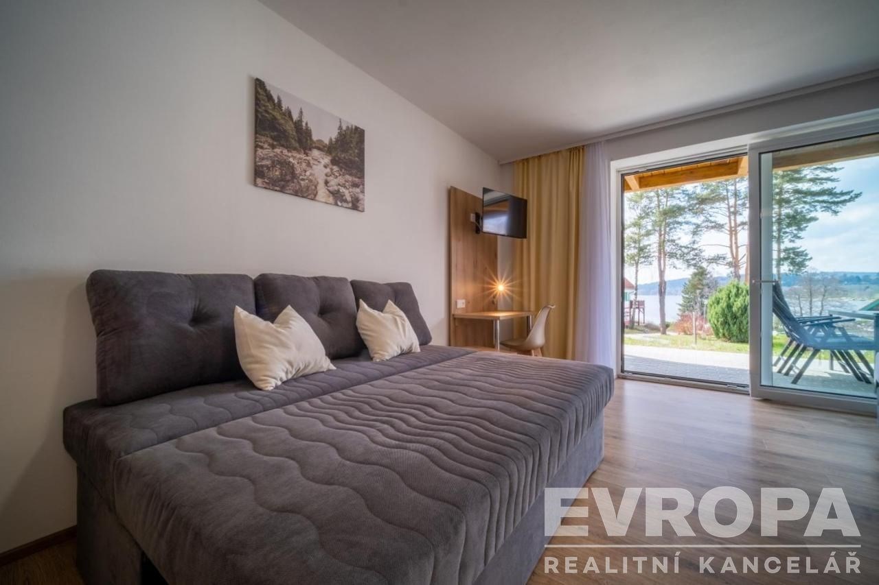 Prodej plně vybaveného bytu apartmánu v Lipně nad Vltavou, dispozice 1+kk, plocha 42m2 + terasa 16,5m2. Byt se nachází v přízemí viladomu, kolaudovaného v roce 2021, na krásném místě v areálu Riviera Lipno, v blízkosti lipenské pláže a docházkové vzdálenosti od turistického centra Lipna nad Vltavou a promenády s restauracemi, kavárnami a obchody. Apartmán se skládá ze vstupní předsíně, prostorného obývacího pokoje, který je rozdělen na jídelní část s kuch. Linkou a část obývací, součástí prodeje je vybavení apartmánu, manželská postel a pohovka, která může po rozložení sloužit jako další 2 lůžka. Navazující kuchyně s barem a barovým sezením je vybavena vším pro pohodlné vaření a stolování. Spotřebiče (lednice s mrazákem, myčka, el. trouba, sklokeramická varná deska, kávovar na kapsle). Ve vstupní hale je umístěna prostorná šatní skříň a nabízí dostatek úložného prostoru. Obrovskou výhodou je výstup na venkovní terasu 16,5m2, která nabízí posezení venku a pěší vzdálenost od Lipenské přehrady. Koupelna se sprchovým koutem, toaletou a pračkou. Součástí je také vlastní sklep pro uskladnění jízdních kol, lyží, kočárků a vlastní venkovní parkování, na privátním parkovišti před apartmánem. Nedaleko je Marína Landal a Skiareálu Lipno moderní, pětihvězdičkový lyžařské středisko zaměřené také na rodiny s dětmi a začátečníky. Skiareál nabízí bezpečné a kvalitně zasněžené sjezdovky o celkové délce 11,6 km. Stezka korunami stromů Lipno s tobogánem je rovněž v pěší dostupnosti. Pronájem je vhodný pro aktivní rodinu s dětmi se širokými možnostmi sportovního vyžití během celého roku, případně jako nadstandardní druhý byt k distanční práci či rekreaci v krásné přírodě. Apartmán je také jako výhodná investice pro pronajímání, o které se stará zavedená firma.