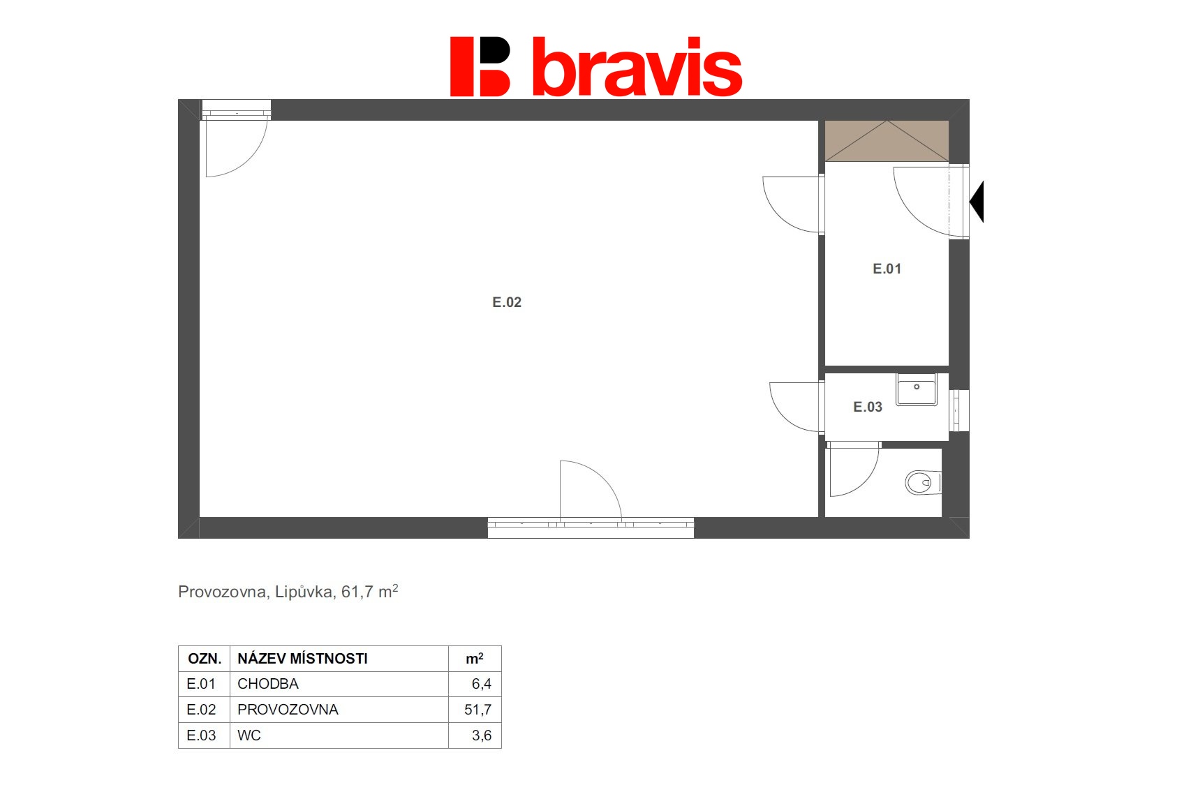 Moderní, praktické prostory pro Vaše podnikání v blízkosti Brna? Přesně takové možnosti nabízí komerční prostor v právě dokončovaném polyfunkčním komplexu Lipůvka! Ve výhradním zastoupení developera nabízíme k prodeji jednotku komerčního prostoru (označeného jako jednotku 1E) o užitné ploše 61,7 m² v obci Lipůvka u Brna. Prostor, nacházející se v prvním nadzemním podlaží, nabízí hlavní místnost o vel. 51,7m2, chodbu a koupelnu s oddělenou toaletou. Vybavení budovy: • Vinylové podlahy a okna s trojskly, které zajišťují maximální odhlučnění a tepelnou izolaci. • Energetická třída B, která Vám ušetří náklady na energie. • Vlastní plynová kotelna v budově pro efektivní vytápění. • Venkovní elektrické žaluzie na oknech obytných místností. V ceně jednotky je zahrnuto také venkovní parkovací stání. Prostor je vhodný ať už pro kancelářské prostory coby sídlo menší firmy nebo obchody se službami (kadeřnictví, cukrárna, kavárna, potraviny, pekařství, apod.) Zaujal Vás tento komerční prostor? Pro více informací nebo domluvení prohlídky kontaktujte uvedeného makléře.