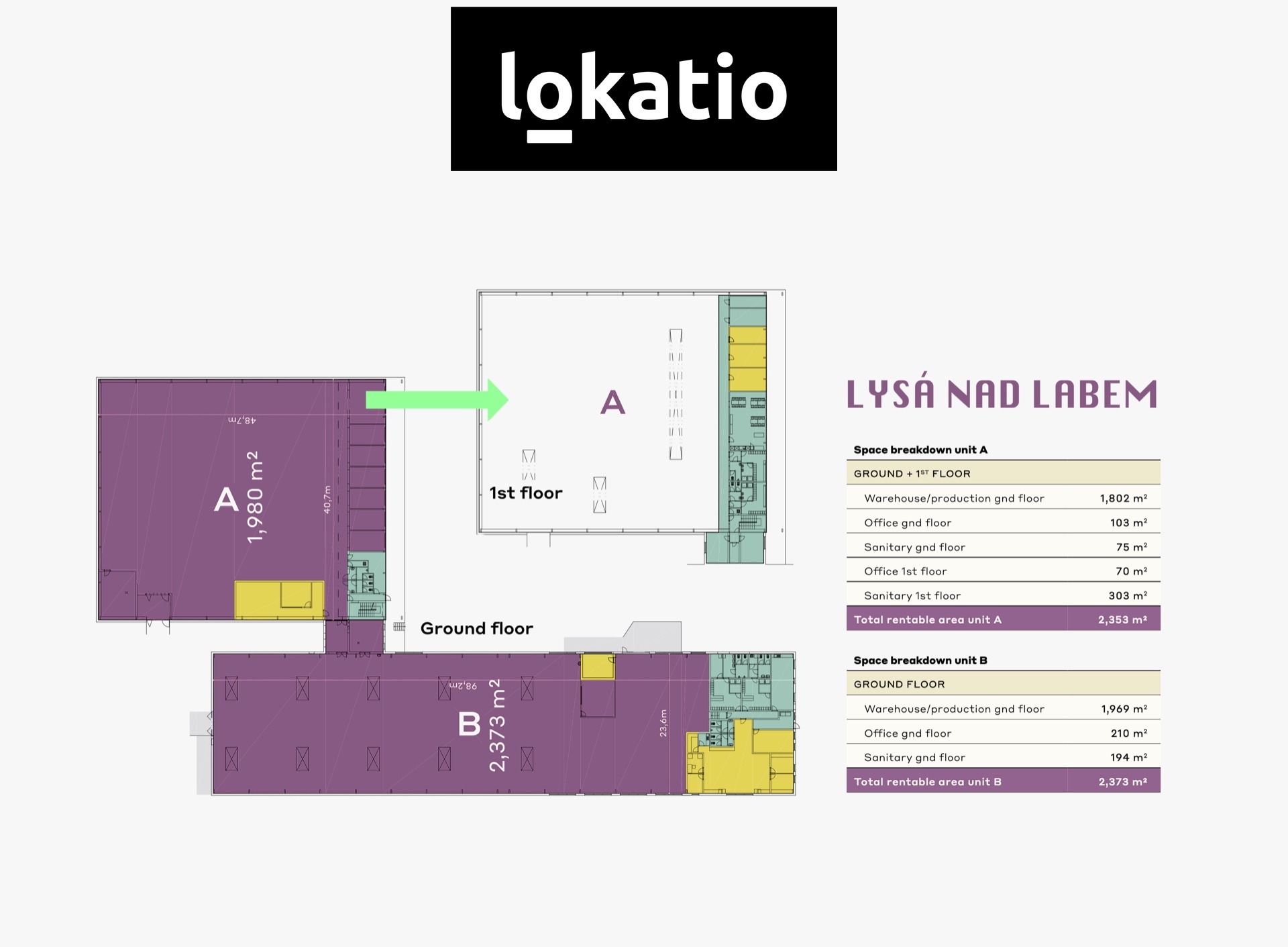 BEZ PROVIZE Nabízíme k pronájmu celý areál v obci Lysá nad Labem. Areál se skládá z dvou větších hal + dvou menších skladů. Součástí větších hal je administrativní a sociální zázemí. Haly jsou určené k výrobě, nikoli pouze ke skladování. Areál nabízí snadný přístup na dálniční tahy D10, D11 a také do Prahy. Hala je určena k výrobě. DOSTUPNÁ HALA ◉ skladovací propojené haly o velikosti: 3 771 m2 ◉ HALA A celkem 2 353 m2 - skladová plocha: 1 802 m2 - kanceláře přízemí: 103 m2 - sociální zázemí přízemi: 75 m2 - kanceláře 1. patro: 70 m2 - sociální zázemí 1. patro: 303 m2 ◉ HALA B celkem 2 373 m2 - skladová plocha: 1 969 m2 - kanceláře přízemí: 210 m2 - sociální zázemí přízemi: 194 m2 DOSTUPNOST ◉ k dispozici do 4 měsíců po podpisu nájemní smlouvy SPECIFIKACE ◉ jedná se o výrobní prostory ◉ světlá výška hala A - 6,50 m ◉ světlá výška hala B - 4,90 m ◉ 9 x nákladní rampa pro TIR ◉ zátěžové podlahy o nosnosti 5 t/m2 ◉ vytápěno pomocí sahar a infrazářičů LOKALITA ◉ Lysá nad Labem ◉ vzdálenosti: Praha 30 km, nájezd na D11 8 km, nájezd na D10 12 km CENA Konkrétní nabídku rádi poskytneme na vyžádání. Pro více informací nás neváhejte kontaktovat.
