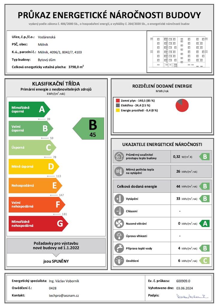 Ve výhradním zastoupení Vám nabízíme k prodeji byty v osobním vlastnictví v novém projektu " Byty Zahrady Mělník", který se nachází v těsné blízkosti centra města Mělník při ulici Bezručova - Vodárenská umístěné v budově "D3". Byty v dispozici 1+kk jsou umístěny v 1 až 6 NP s výtahem, výměra cca 44 m². Všechny byty mají v ceně buď balkón, lodžii, terasu nebo předzahrádku a většina také přiřazené parkovací stání v ceně. Aktuální nabídka bytů a informace o projektu a výstavbě najdete na " Bytyzahradymelnik.cz " Zahájení výstavby leden/2026. Dokončení kolaudace - jaro/2028. Projekt „Zahrady Mělník“ se nachází v bezprostřední blízkosti centra města Mělníka, v ulici Bezručova - Vodárenská. Je koncipován jako moderní rezidenční areál tvořený pěti bytovými domy o šesti nadzemních a jednom podzemním podlaží, všechny s výtahem. Celkem 53 bytových jednotek v objektu D3 (osobní vlastnictví) je navrženo v dispozicích 1+kk, 2+kk, 3+kk a 4+kk s plochami od 29 m² do 92 m². Všechny byty disponují balkónem, terasou nebo vlastní předzahrádkou, což zajišťuje dostatek soukromí i prostoru pro relaxaci. Součástí ceny většiny bytů je vyhrazené parkovací stání – buď v podzemní garáži, nebo venkovní parkovací místo dle konkrétní jednotky. Město si dodnes uchovává jedinečnou historickou atmosféru, která je úzce spjata s vinařskou tradicí, zámkem Mělník a dominantním kostelem sv. Petra a Pavla. Zároveň nabízí kompletní občanskou vybavenost, pestrý kulturní a společenský život a bezprostřední kontakt s přírodou v okolí řek, vinic a lesů. Díky dobré dopravní dostupnosti do Prahy i dalších regionálních center, širokým možnostem péče o děti, dostatečné kapacitě základních i středních škol, pestré nabídce sportovních zařízení a možnostem aktivního trávení volného času je Mělník ideálním místem pro kvalitní život rodin i jednotlivců.